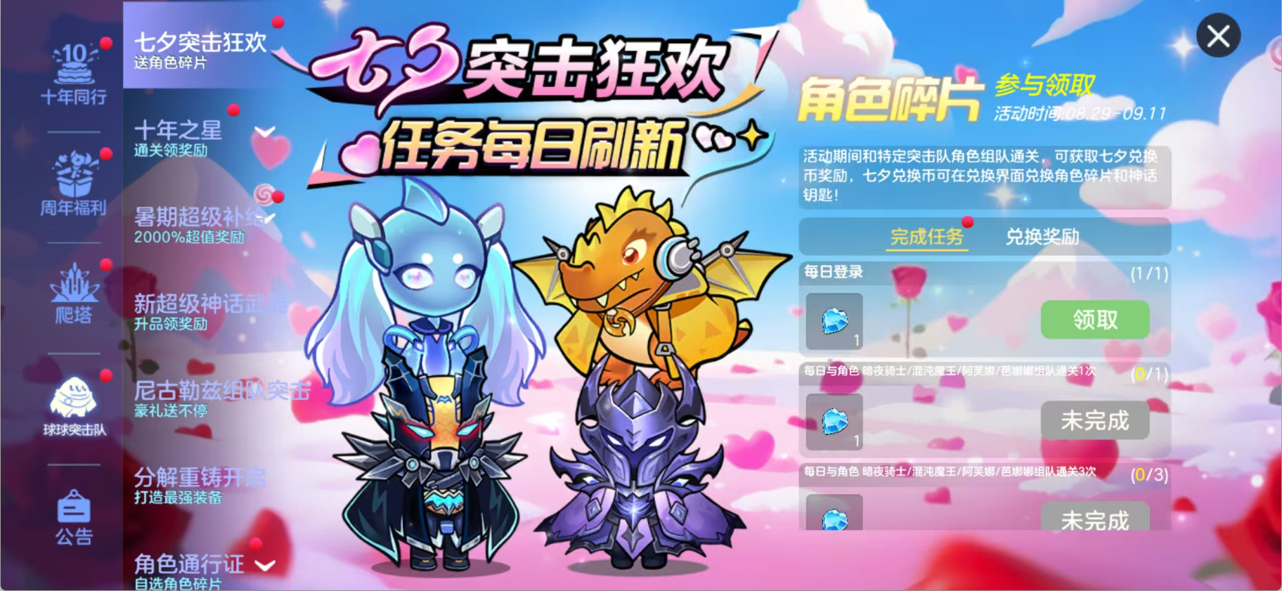 突击队也听到球宝们的呼唤啦!同期开启七夕狂欢活动~从8月29日到9月11日,每天做任务就能免费领取七夕兑换币!和好朋友一起开黑收集兑换币,还能兑换混沌魔王碎片、阿芙娜碎片、芭娜娜碎片、暗夜骑士碎片,甚至神话角色钥匙!这些可是平时要攒超久的宝贝呀~