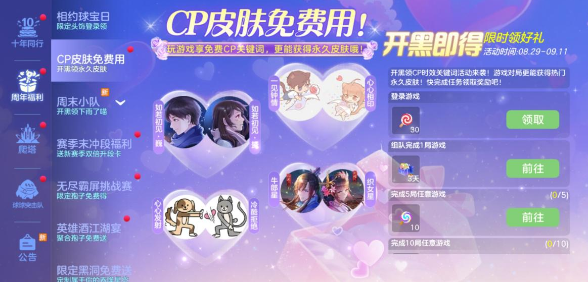 单身不孤单,有CP更甜蜜!活动期间,CP皮肤免费用,和好朋友开黑还能领取CP时效关键词~超有仪式感对不对?参加对局还能拿到永久热门皮肤!「爱的么么哒」、「单身贵族」、「单身汪」这些超受欢迎的皮肤,现在都有机会免费带回家!呜呜呜这也太香了吧~