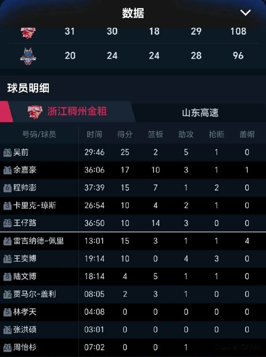 浙江男稠州女稠州,双双胜对手。 浙江男稠州女稠州,都是光速球。 男稠州队主场108-96光速山东高速队。 女稠州队客场109-81光速天津冠岚队。 首次亮相的小个琼斯投进10分,第一场比赛看不出能力咋样,能否达到王奕博水平。