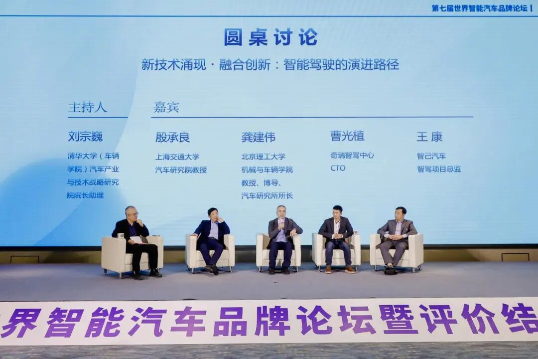 随后的圆桌讨论环节,以 “新技术涌现・融合创新:智能驾驶的演进路径” 为主题,清华大学(车辆学院)汽车产业与技术战略研究院院长助理刘宗巍主持,上海交通大学教授殷承良、北京理工大学教授龚建伟、奇瑞智驾中心CTO曹光植、智己汽车智驾项目总监王康围绕四大核心议题展开深度交流。