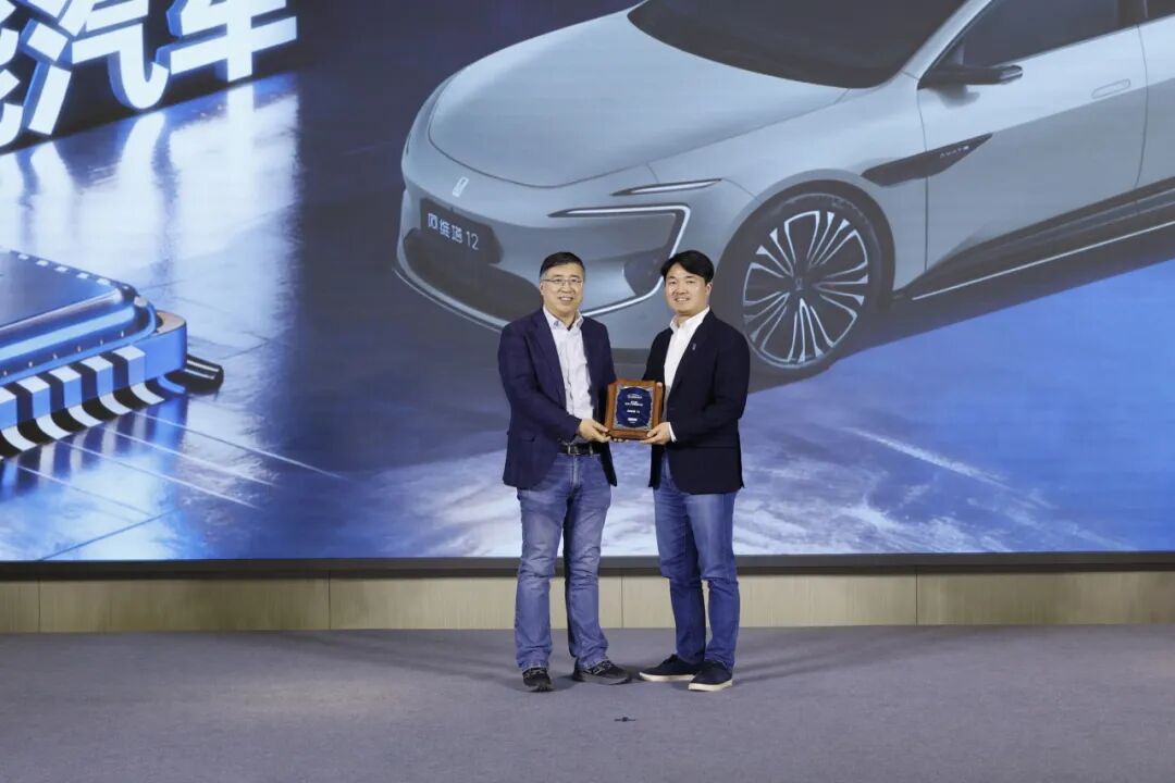 上海交通大学汽车研究院教授殷承良为腾势汽车品牌公关经理王志鹏授牌