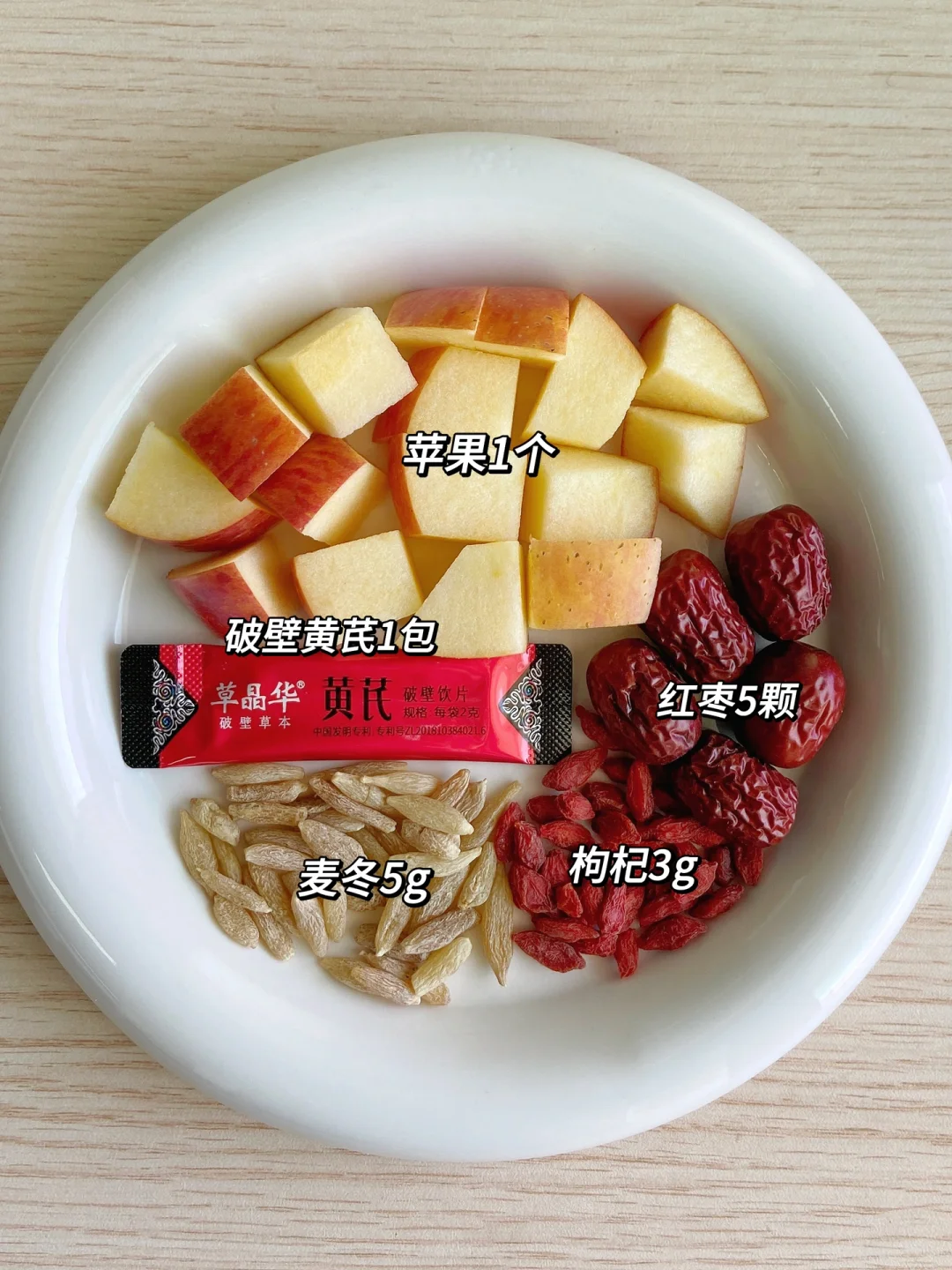 🌟食材:苹果1个+去核红枣5颗+麦冬5g+枸杞3g+草晶华破壁黄芪1袋