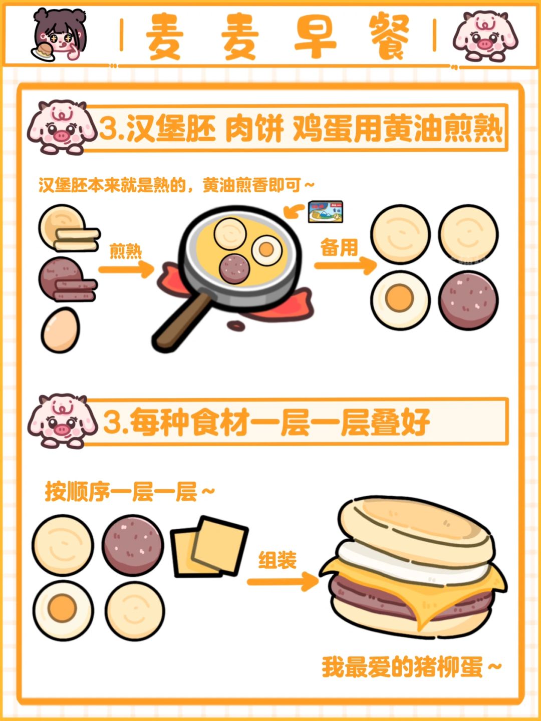 3️⃣肉饼和鸡蛋🥚下锅煎熟 汉堡胚用黄油🧈煎香,一层汉堡胚一层肉饼一层芝士🧀一层鸡蛋一层汉堡胚组装
