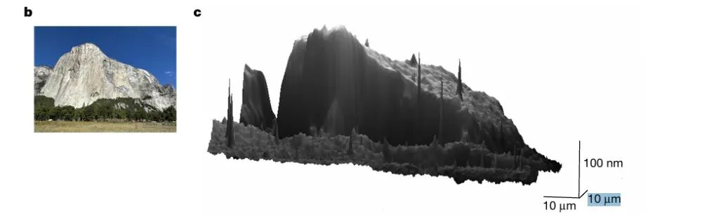 但若要达成微缩模型般细腻的连续起伏,仅靠单纯“吸水膨胀”是无法实现的。 研究团队引入了异丙醇(IPA)作为调节剂,它能有效抑制聚合物的膨胀。通过调节流过表面的液体中水与 IPA 的比例,就像旋转调光旋钮一样,可以精准控制膨胀的幅度。为了展示这种精度,团队甚至将高耸的美国约塞米蒂国家公园的“酋长岩”在薄膜上完美重现。