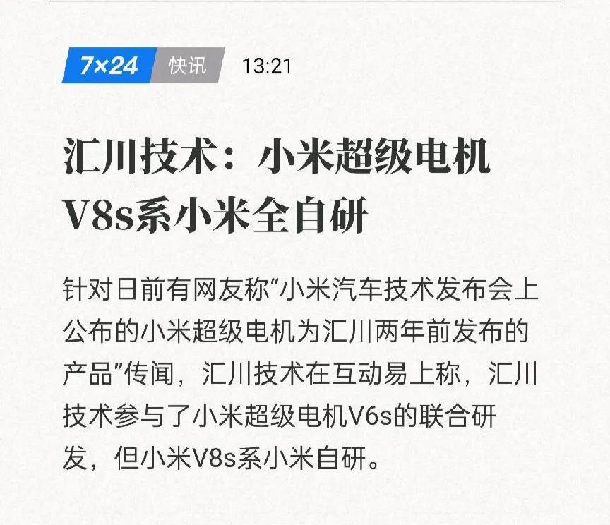 你们猜为啥小米汽车SU7为啥价格还没公布,黑稿就满天飞了?各种带节奏造谣的人全部都跳出来了,前不久小米才刚刚辟谣那个芯片泄密的事情,现在又有小丑跳脚出来说小米的电机自研是假的,小米偷材料。 结果现在汇川技术直接正面回应,小米超级电机V8s就是全自研,汇川只参与了V6s的研发。假如说小米汽车一点威胁没有,一点实力没有,一点热度没有,我相信也不会有这么多造谣,说话不负责任的人吧。 小米汽车技术发布会这么多人都在盯着,雷军肯定是谨言慎行,说是自主研发的怎么会是假的,动动脑子都知道谁对谁错。小米这么踏踏实实造车的企业到底动了谁的奶酪?100亿的资金研发难道也是假的,小米这么大个年财报摆在那你们不会看不见吧,等SU7价格公布,应该避免不了又一场腥风血雨了。#汇川技术回应参与小米汽车电机研发#