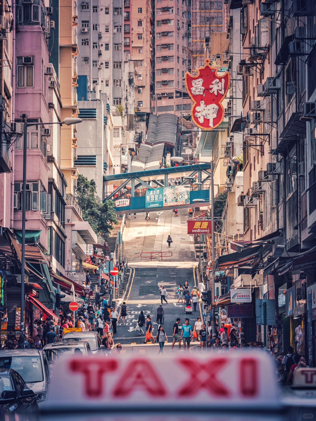 营盘正街,街市旁边,红色的国栏蓝色空中过道一起,尽头是海,非常有香港特色