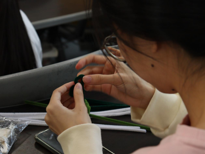 活动伊始,团支书林颖瑶同学阐述本次活动的背景与意义,指出诗词与茶文化同为中华文脉的重要载体,青年学子应在亲身参与中增强文化认同,担当传承使命。伴随欢声笑语,支部成员们手持七彩扭扭棒,以“茶”为灵感,自由驰骋想象。指尖翻转间,柔韧的材料渐渐绽放为清雅的茉莉、舒展的茶叶、古朴的茶壶……一件件生动别致的手工作品悄然成形,茶的文化意象也在缠绕与塑造中变得可触可感。
