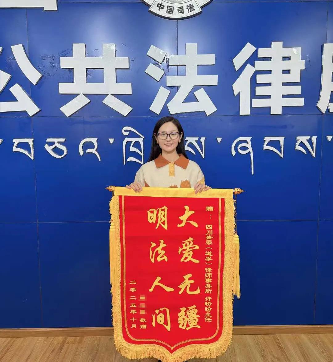 共工新闻社•共工财经局讯(雷良)近日,四川盛豪(道孚)律师事务所主任许盼盼律师收到一份来自当事人的特殊“礼物”——一面印有“大爱无疆,明法人间”的锦旗。这面跨越山川邮寄而来的锦旗,是当事人对许盼盼律师专业服务的由衷认可与感谢,事情源于一起牵动人心的民工讨薪案件: