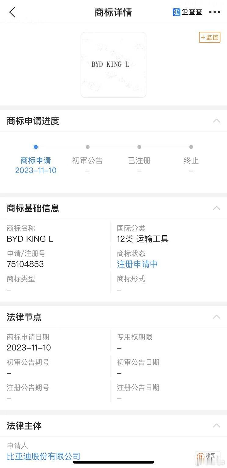 企查查上的信息显示,比亚迪不久前开始申请注册两个新商标:BYD KING和BYD KING L,二者的国际分类均为“12类 运输工具”——也就是说如果注册申请成功,将会有比亚迪的新车型叫这个名字。