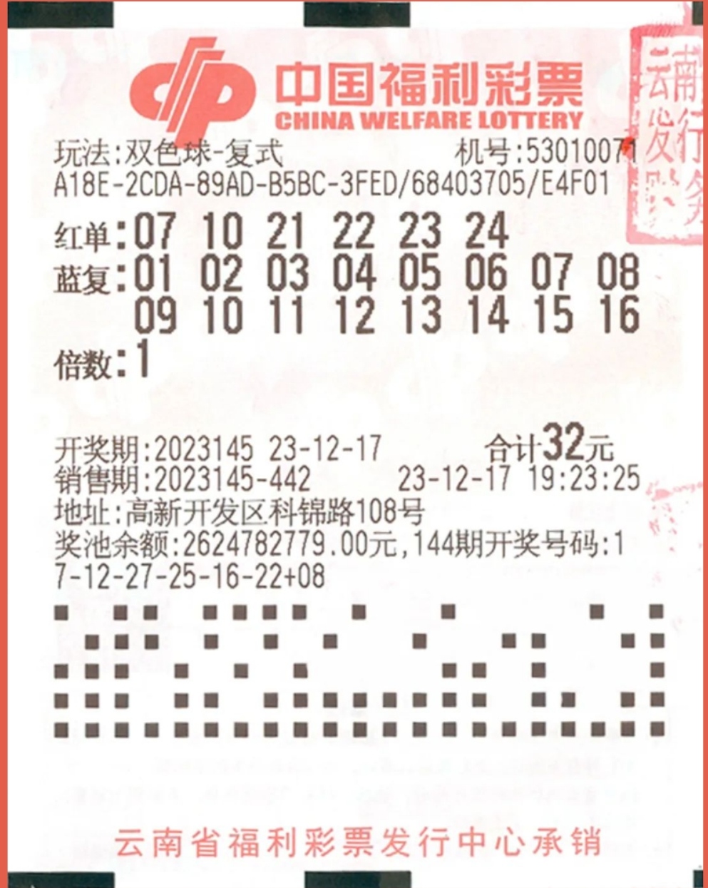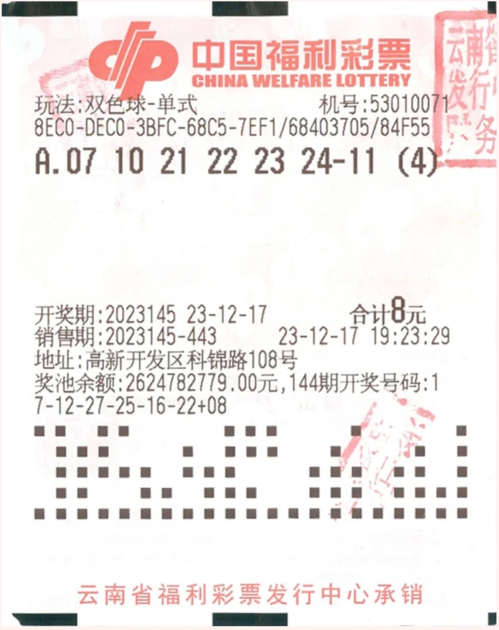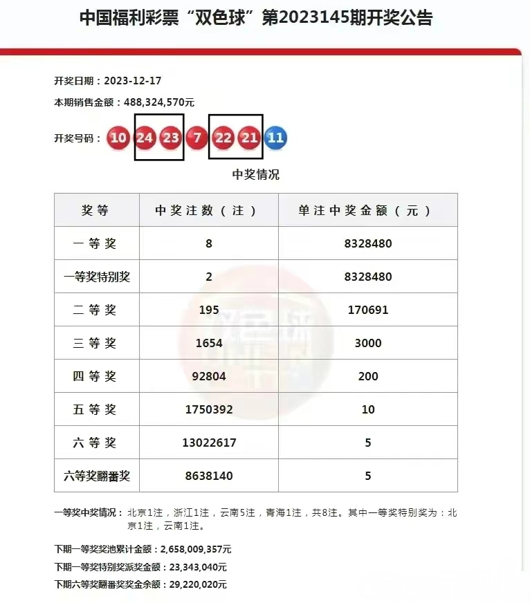 12月17日,福利彩票双色球第2023145期开奖,意外开出神奇的四连号,开奖号码为:红球07、10、21、22、23、24;蓝球11。