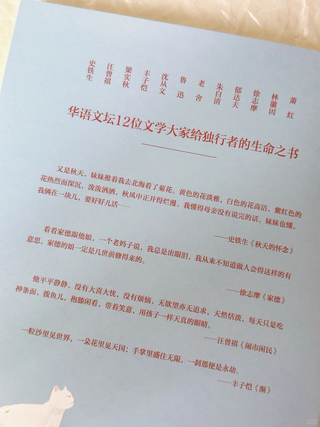 ▫️这本书收录史铁生、汪曾棋、沈从文等12位文学大家的40余篇散文名篇。他们用温暖的文字书写人世间最美好的东西:爱、友情、亲情、勇气和真诚。人生路上,我们会遭遇风暴、挫折与创伤,但别慌张,它终将让我们变得坚韧、宽容和充盈,从而走向生命的辽阔。