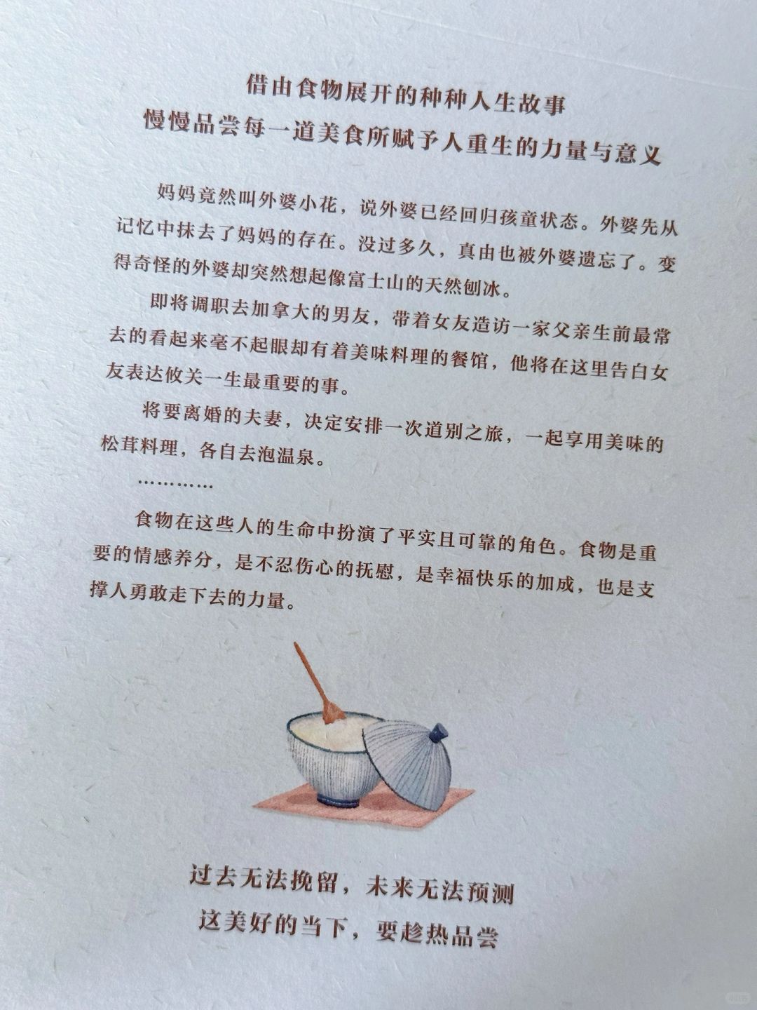 ▫️这本书是小川糸散文的随笔新作,一如既往地,她把带有浓厚疗愈色彩的的文字带给我们,她在书中为我们讲述的5个借由食物展开的人生故事,仿佛一道道精心烹制的菜肴,让我们品尝到能让心灵为之一颤的生活滋味。