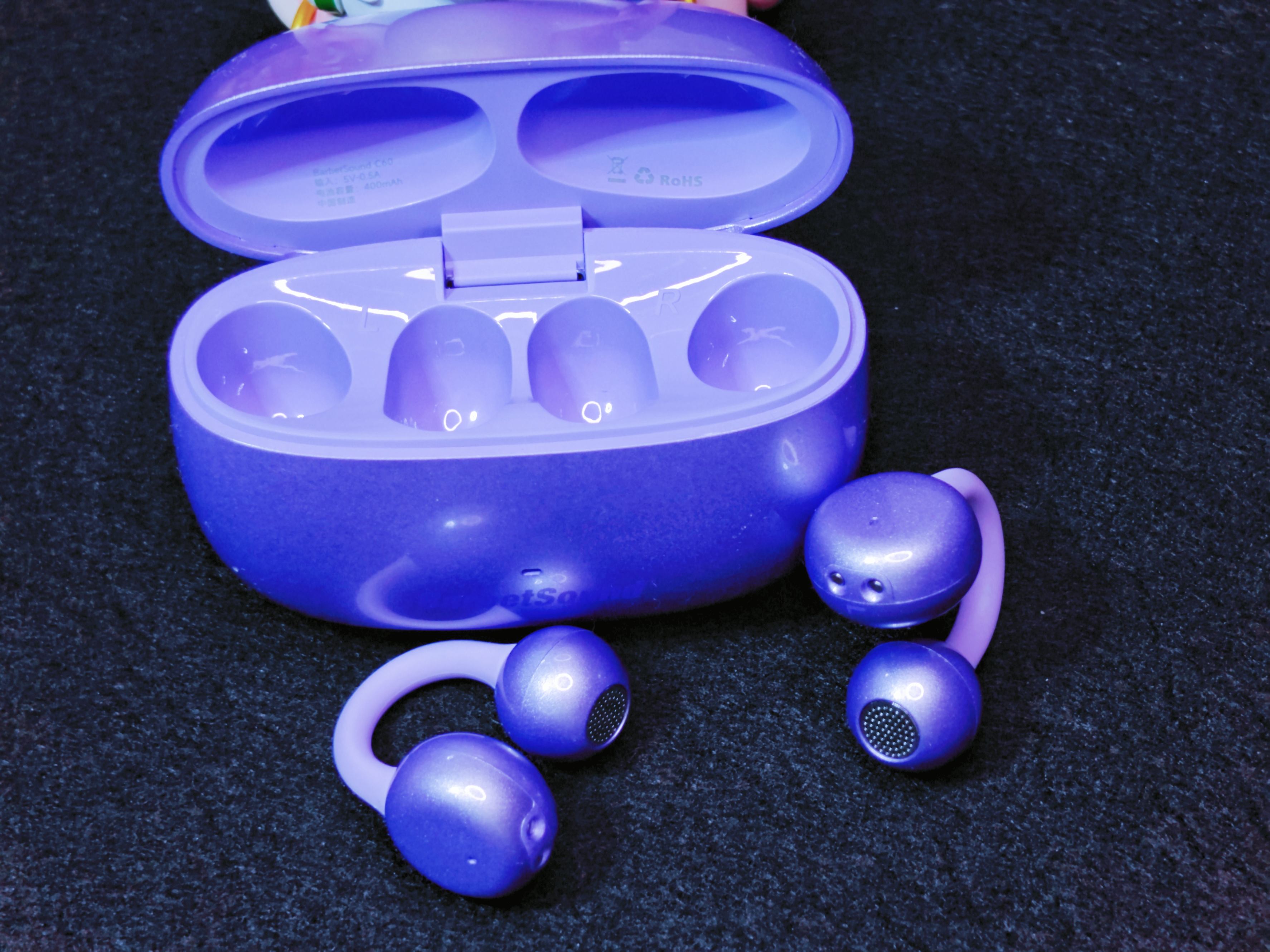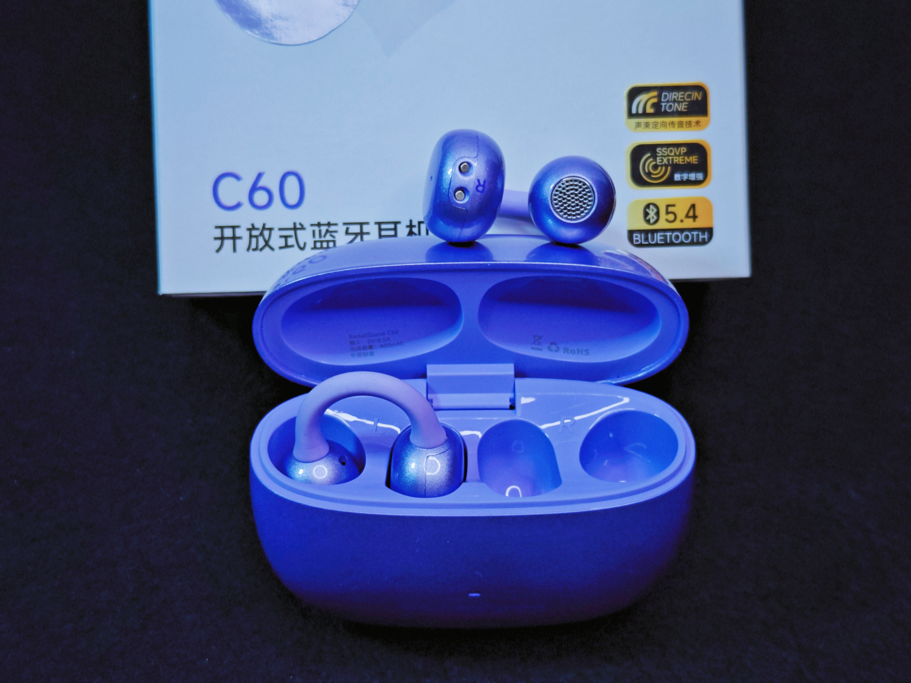 拿出耳机本体,瞬间被它的“星光肌”击中!C60采用旗舰级珠光漆工艺,机身流转着细碎珠光,像把银河揉进了耳机里,百元价位做出千元质感。C型桥设计是佩戴舒适的关键:亲肤硅胶材质360°贴合耳廓,3.6g轻若无物,久戴不胀耳;不入耳结构既能感知环境音,又避免了入耳式耳道的压迫感,学生党自习戴3小时依然“无感”,运动时狂甩也不掉。