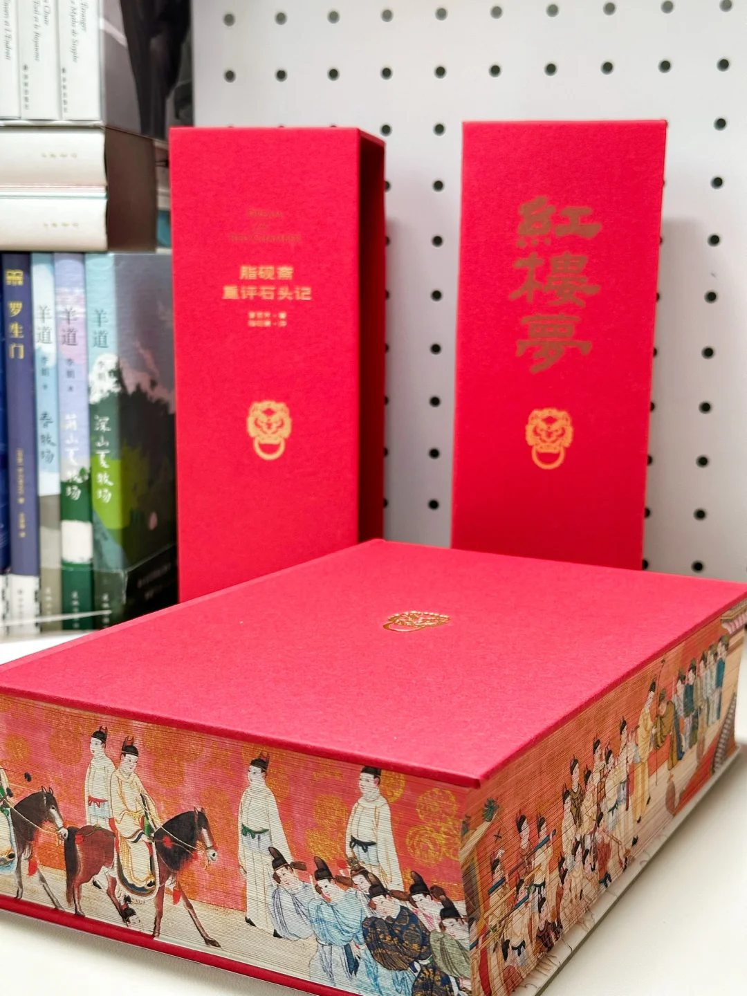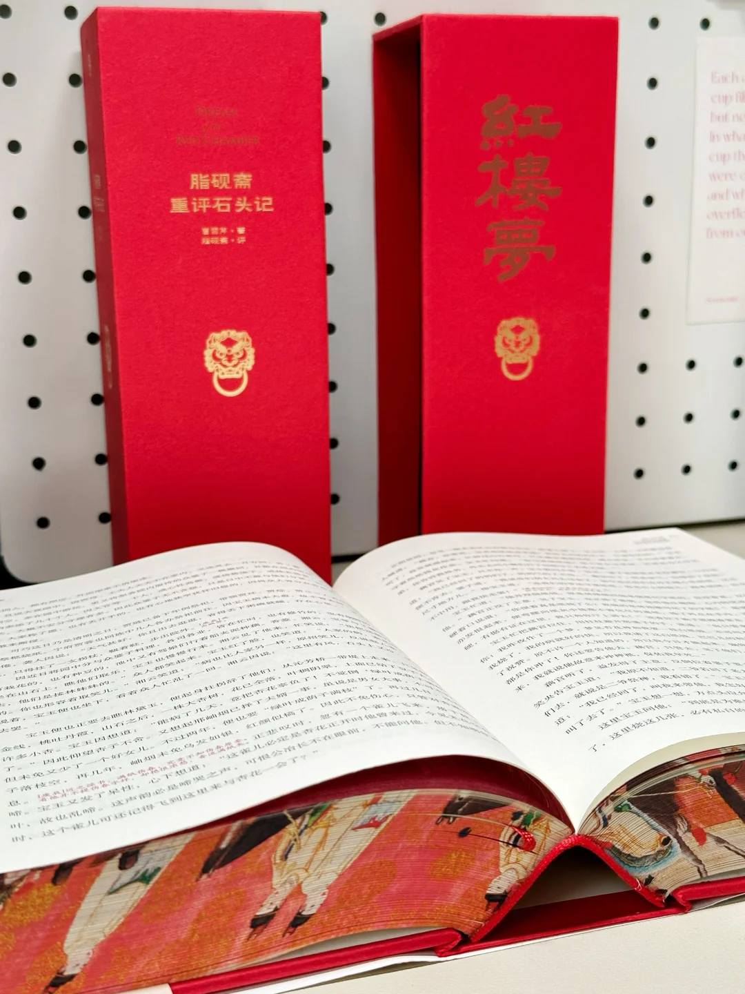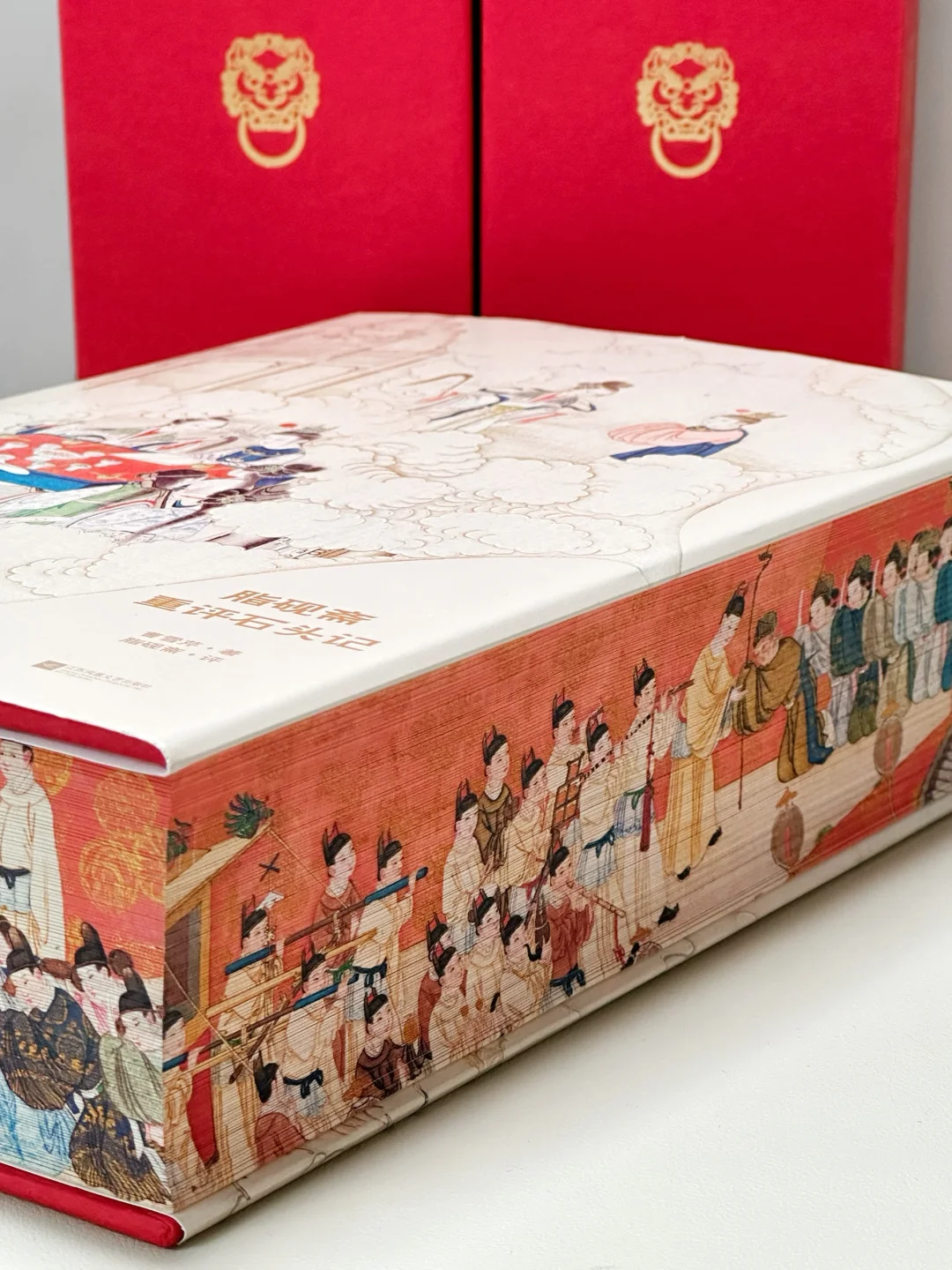 🔥不得不说,这本《红楼梦》真是我珍藏的所有版本中颜值最高的一版了。大红色的硬装外壳,做了抽拉式设计,缓缓向两边拉开,一幅宝玉神游太虚幻境的精美图画便呈现在眼前。更别提书的侧面的“元妃省亲图”3面刷边了!这是奔着传家宝的规格制作的啊‼️