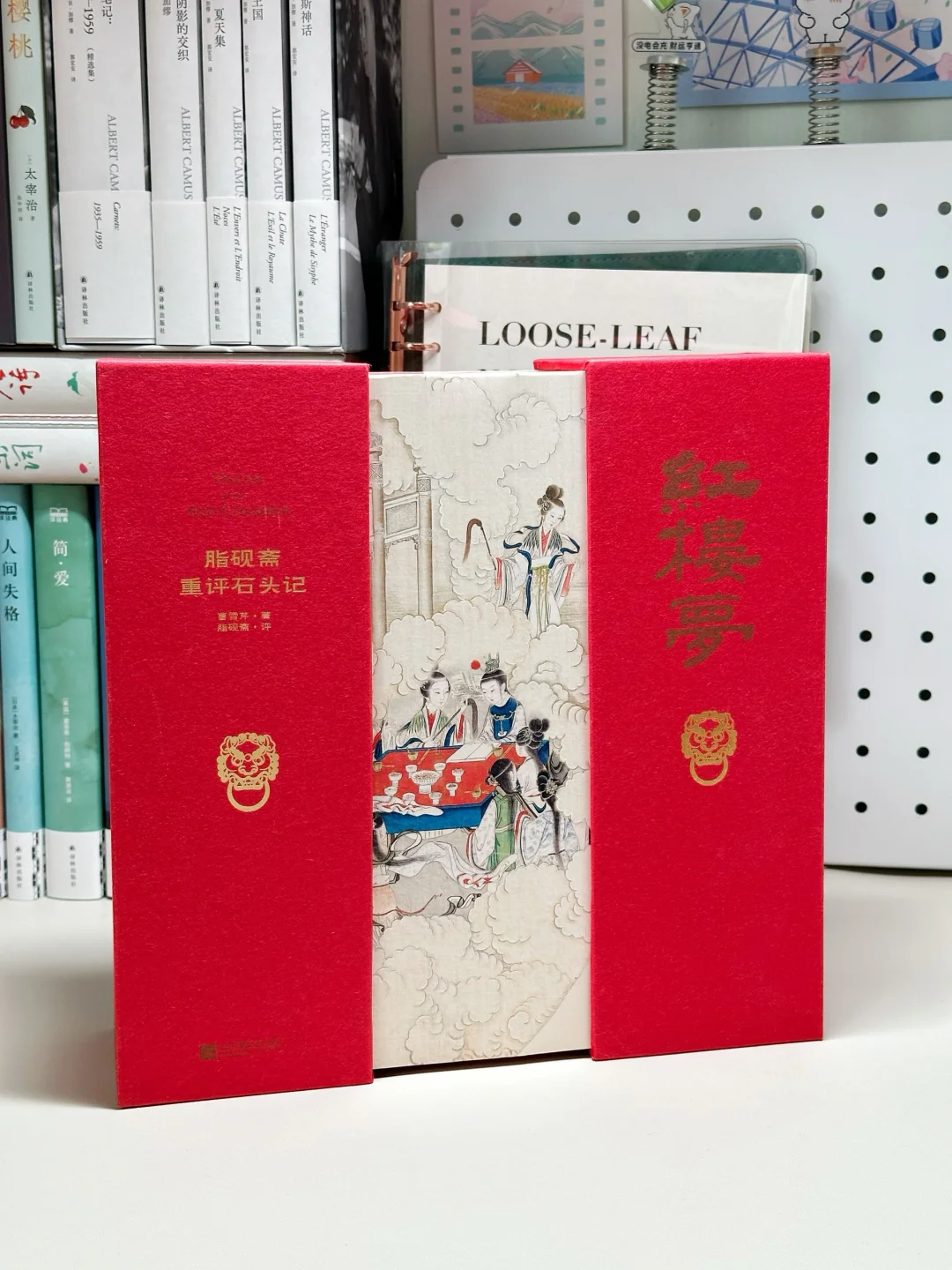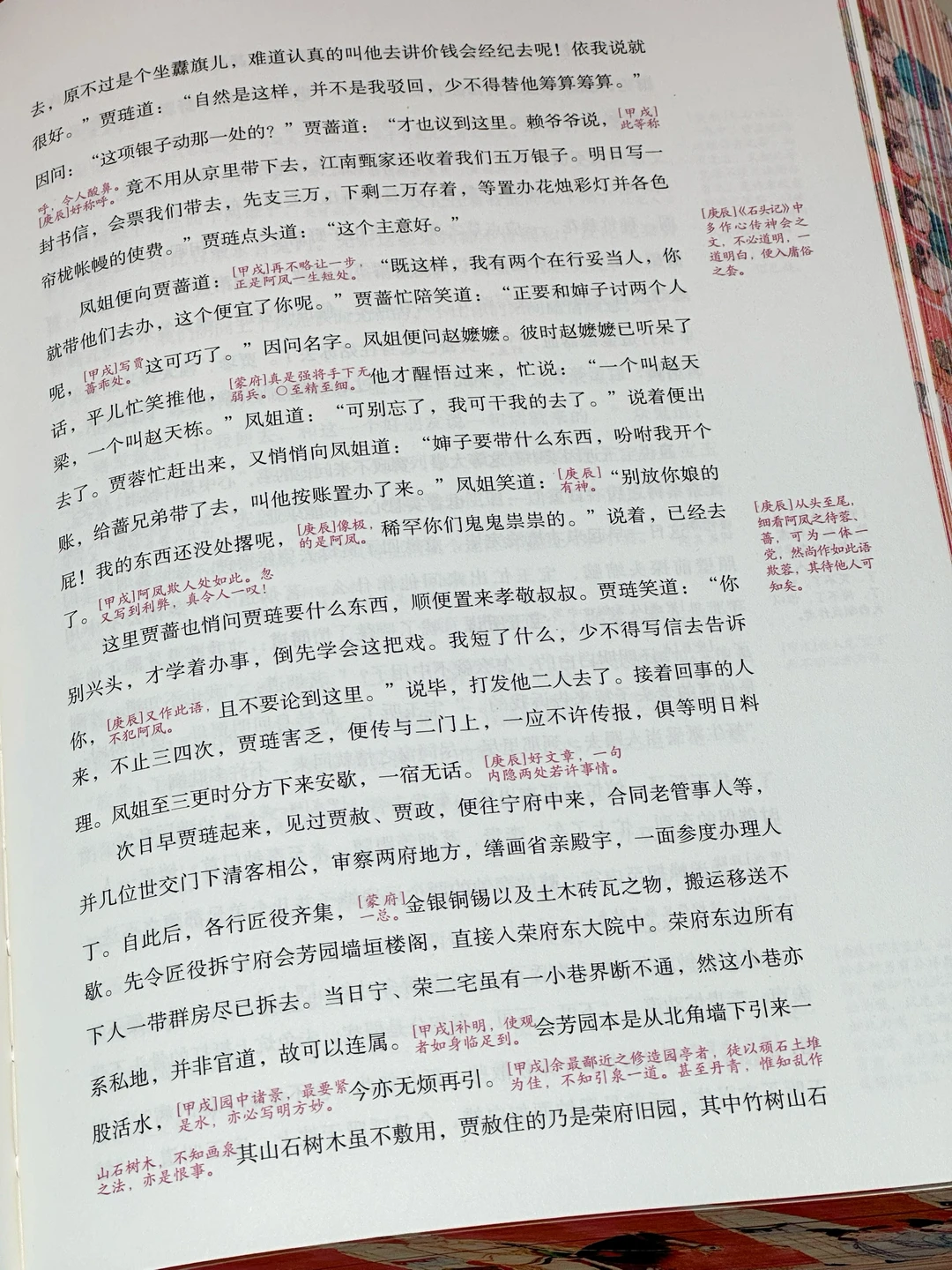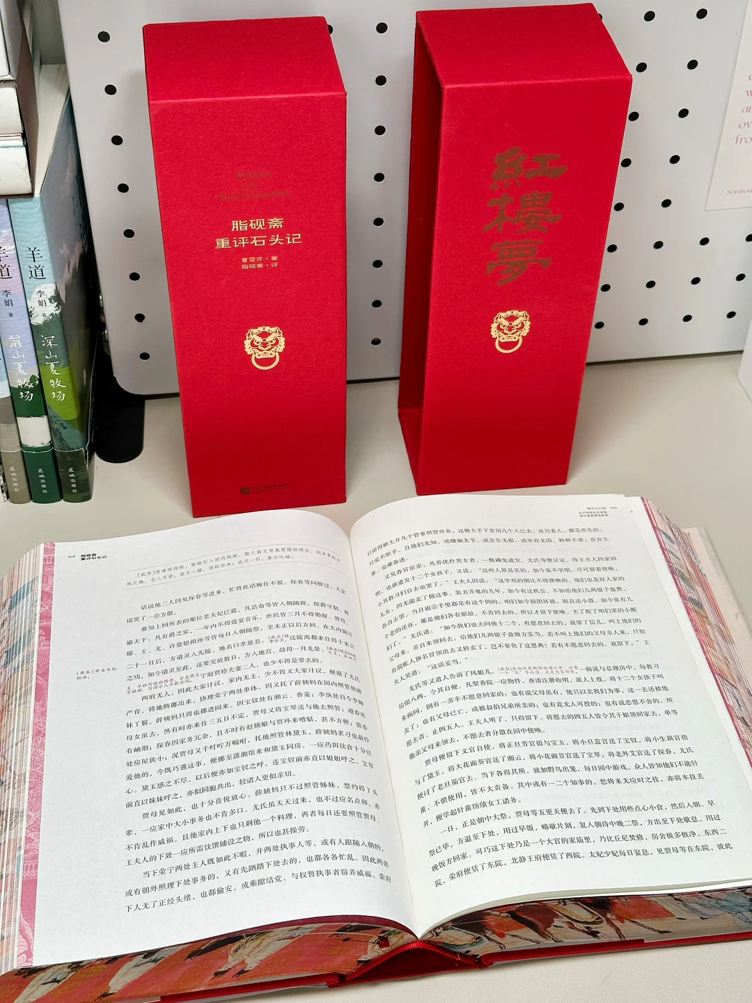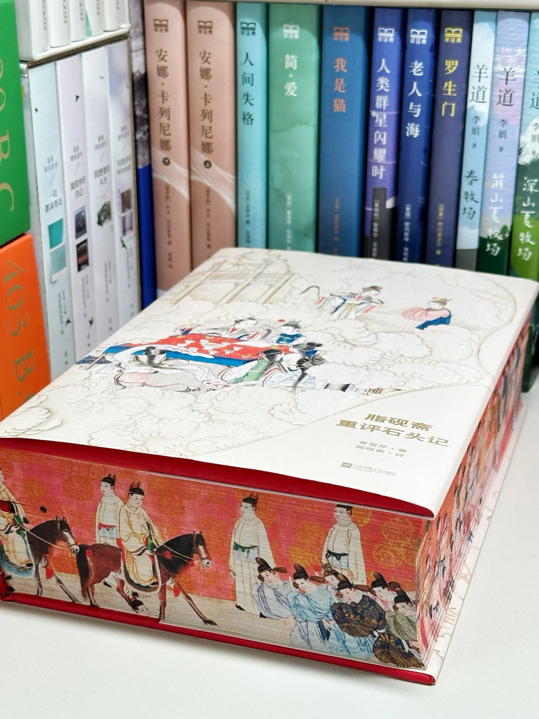 🔥不得不说,这本《红楼梦》真是我珍藏的所有版本中颜值最高的一版了。大红色的硬装外壳,做了抽拉式设计,缓缓向两边拉开,一幅宝玉神游太虚幻境的精美图画便呈现在眼前。更别提书的侧面的“元妃省亲图”3面刷边了!这是奔着传家宝的规格制作的啊‼️