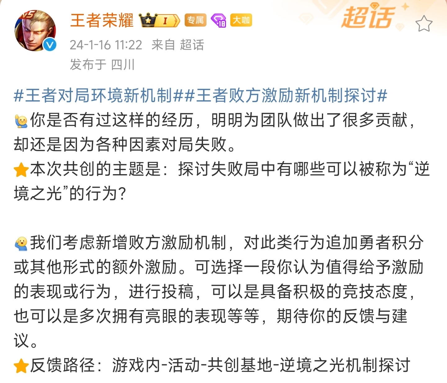 #王者败方激励新机制探讨##王者对局环境新机制##王者荣耀# 败方新机制探讨活动[doge]失败了不要紧,达成某些行为条件,会有激励补偿,可以是勇者积分或者其他激励,目前还不确定~那么问题来了:兄弟萌觉得啥样的行为才是亮眼的表现?