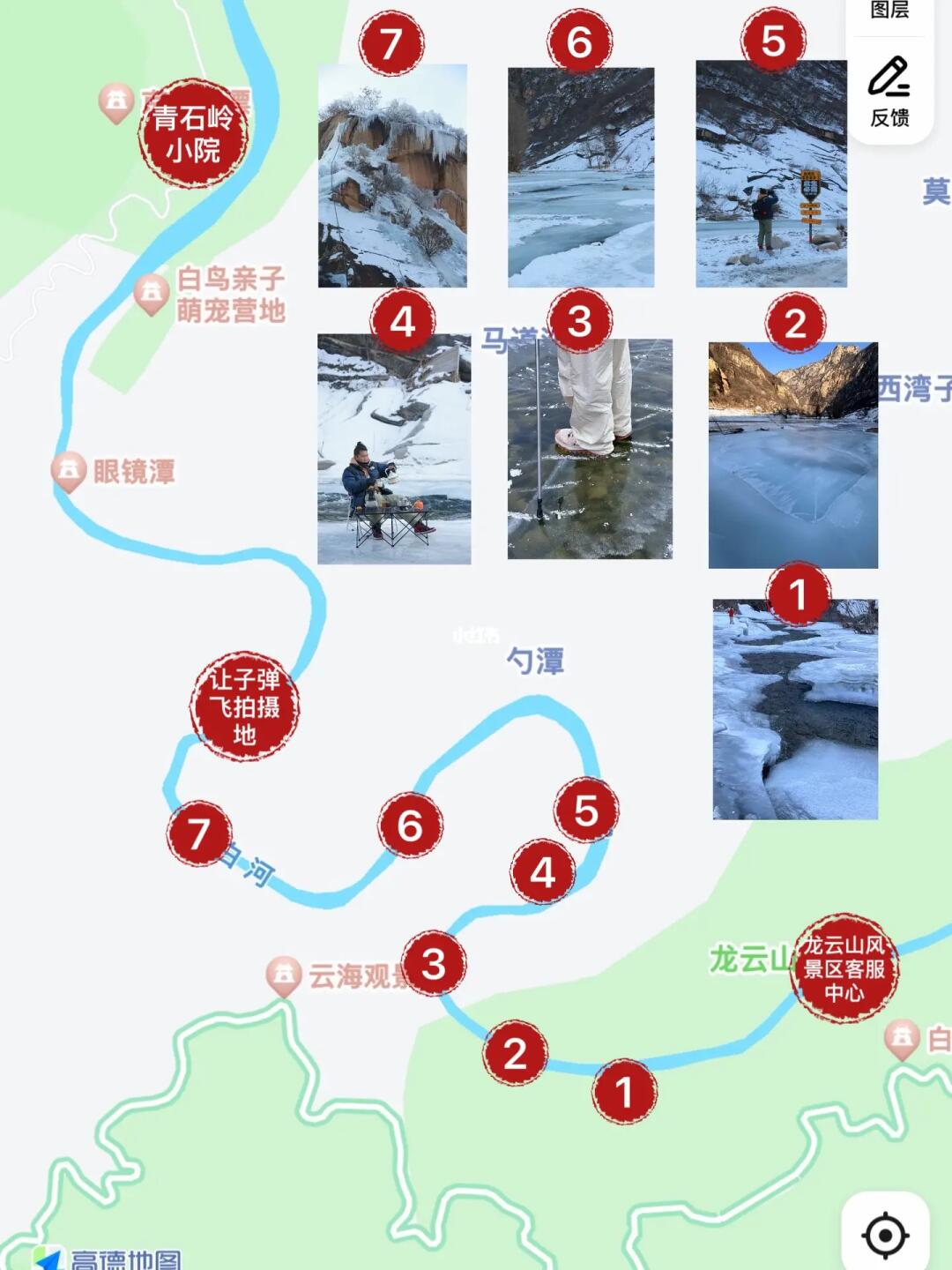 1⃣️🚙导航到青云山风景区客服中心,(图8地图🗺️)车可以停这里下去,龙云山风景区收费 20💰,非环线路,需要返回停车点,徒步到冰瀑可以返回,预计3.5-4公里,从1号走到7号,冰瀑那是云梦仙境营地边上,再往前就到让子弹飞的拍摄地。(这个时间最长)