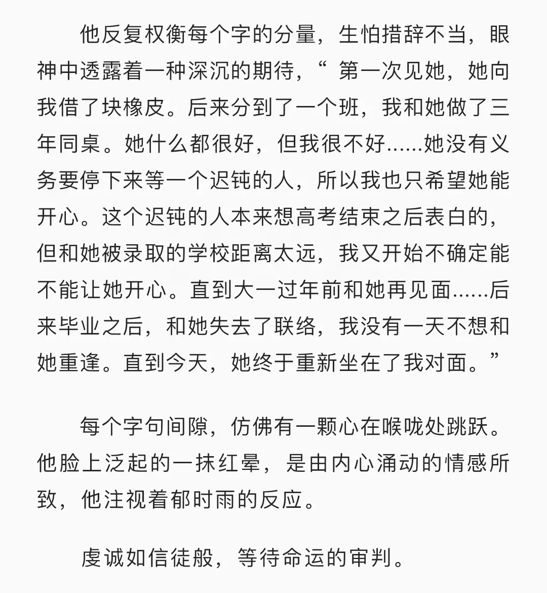 男主高一第一眼见到女主就动心了,只是那会儿只敢默默对她好,然后眼睁睁看她早恋,大一女主说不想谈异地恋男主只能隐忍,大二好不容易鼓起勇气去找女主,却看到她有了新男友,真的太惨了哈哈哈,后来她分手,他疯狂给她发微信女主却一条也没回过。哪怕是这样,大学毕业他还是义无反顾来到她的城市,期待重逢的那一天,好在彼此重逢在成熟的时刻