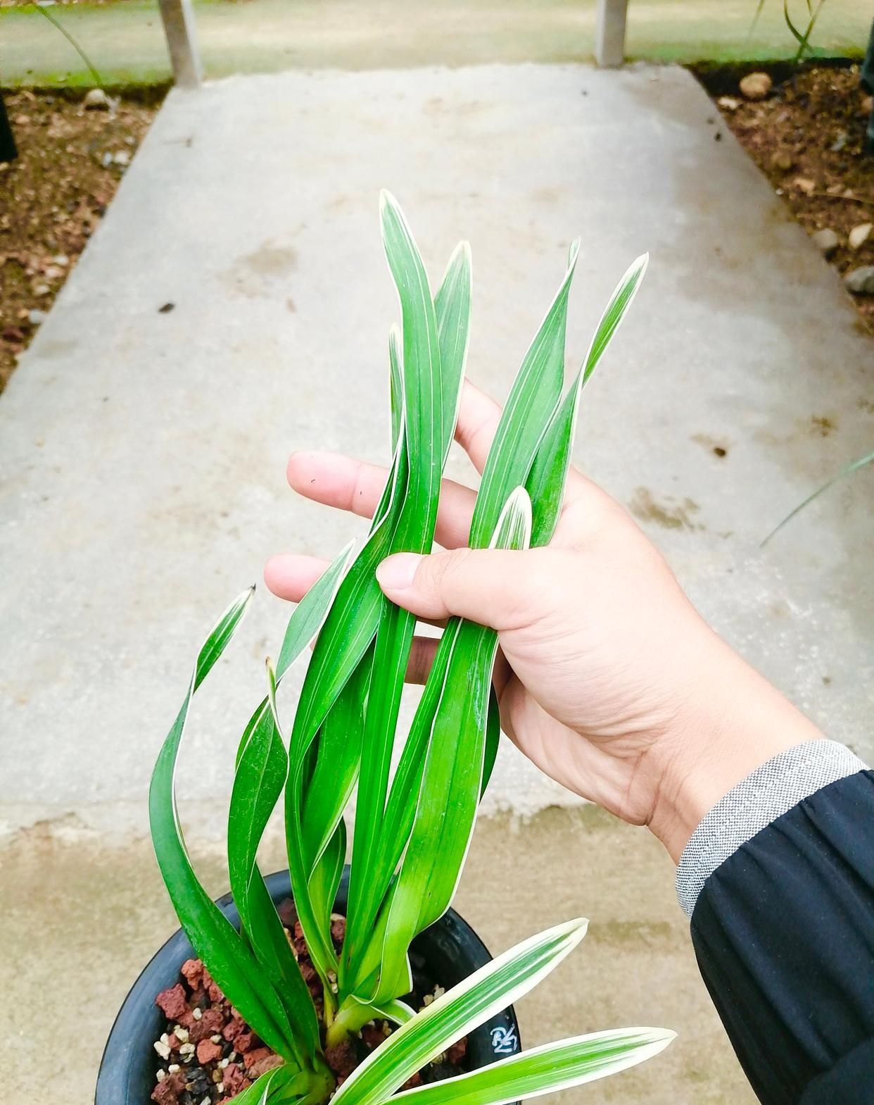 根快烂完的兰花越来越壮了,艺态也很好 这盆兰花是越来越壮了,别人送来的时候,根快烂完了,我把植料换成了松栗王植料混合火烧石后,发了1个新苗出来,之前的2个老苗叶片长度也增长了一倍多了,有我两个手掌长度了,现在还在继续生长,叶上的艺色和小苗基本一致,不像有的品种长着长着边艺就窄了,甚至消失掉。