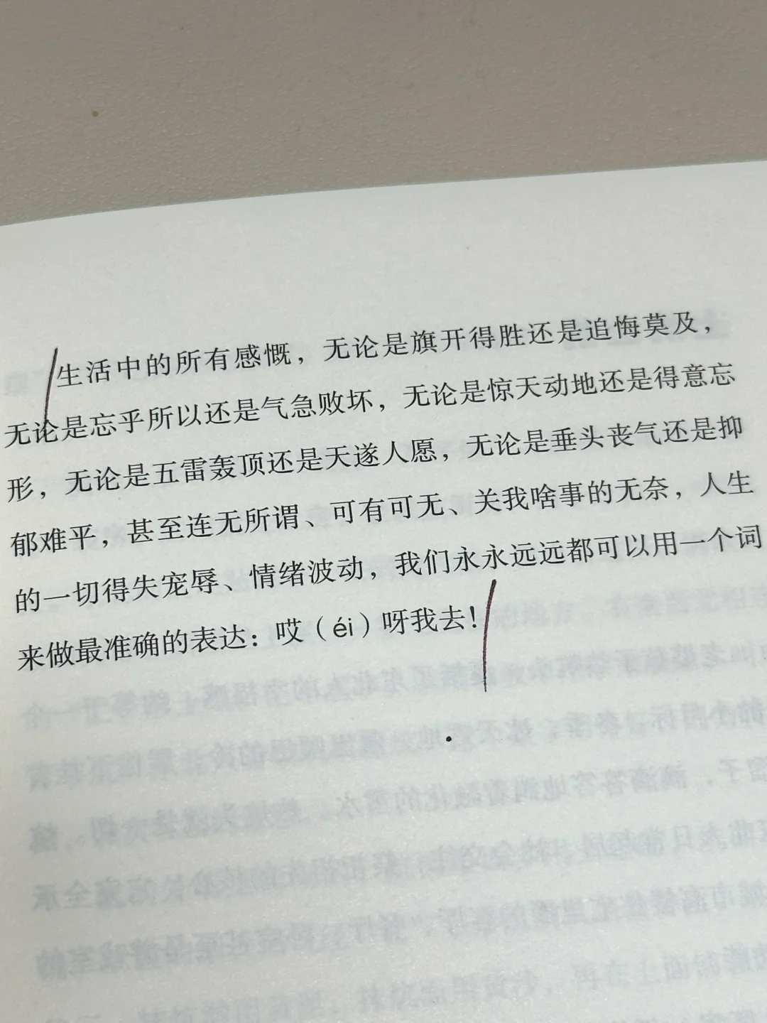 “生活中的所有感慨,无论是旗开得胜还是追悔莫及,无论是忘乎所以还是气急败坏,无论是惊天动地还是得意忘形,无论是五雷轰顶还是天遂人愿,无论是垂头丧气还是抑郁难平,甚至连无所谓、可有可无、关我啥事的无奈,人生的一切得失宠辱、情绪波动,我们永永远远都可以用一个词来做最准确的表达:哎呀我去!”