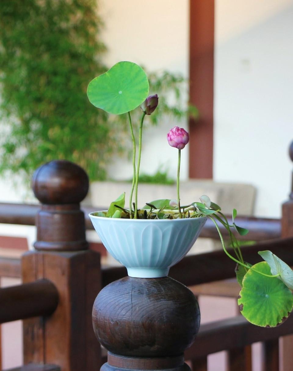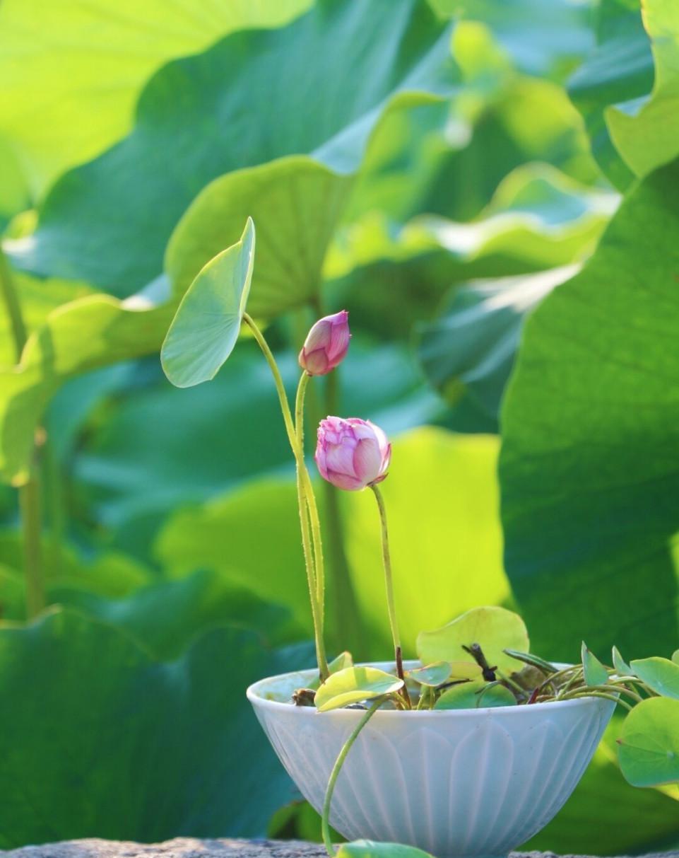 碗莲的日常养护: 1.浇水: 如果碗莲缺水,叶片边缘会开始干枯,发现后应及时浇水。浇水时要选用细眼喷壶,或沿盆壁慢慢淋下。不可直接将水倒入花盆内,否则会冲坏花芽、叶芽。碗莲成苗期是其生长的高峰期,每天早晚要各浇一次水,并保持盆碗满水。 2.光照: 阳光充足,不耐阴。喜热,生长适温为20~30℃,夏季生长旺盛。碗莲每天至少需要7~8小时的日照,光照越充足对碗莲的生长发育越有利。 注意点:在碗莲开花后,若将其移入室内欣赏,则每隔2-3天需将其移出到户外阳光下养护,否则影响其生长;适时转盆,一般每周转动一次,这样即可保持碗莲株型整齐,还可加强光照。 3.施肥: 碗莲在种植的过程中要注意适量施肥。碗莲喜肥,若缺少肥料,碗莲就会缺乏生机,则生根长叶缓慢或有叶小、色黄、瘦弱,缺乏生机的现象。所以栽植前盆土中应拌入少量腐熟饼肥液或豆麸、花生麸作为底肥。但是,碗莲虽是喜肥植物,却不可过量施肥,否则会导致碗莲烂根而死。 4.修剪: 控制叶片数量,若太密集,可适当摘除一部分,以利植株呼吸透气。养护植物总会出现黄叶、枯叶的情况,还有些叶片比较茂密,阳光照不进盆内,这样也会影响现蕾,所以我们需要适当地修剪一下。这样有利于植株呼吸透气,也有助于碗莲着花。