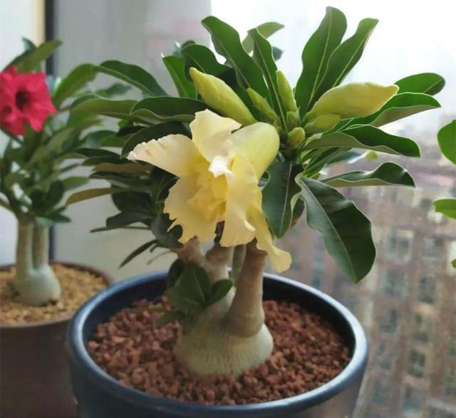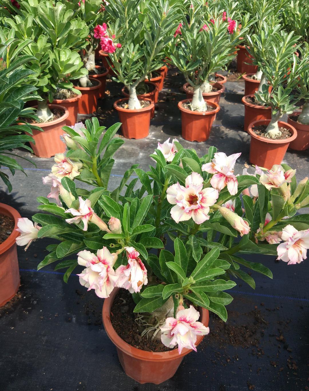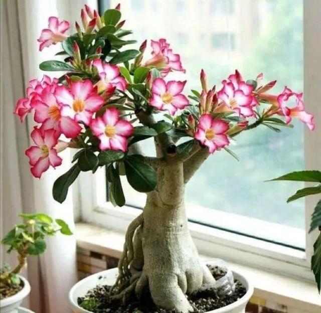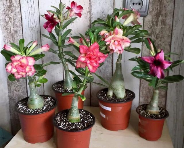 观赏品种的沙漠玫瑰,花朵更大,花色更丰富 沙漠玫瑰并不是沙漠里的玫瑰花,而是一种多年生长的多浆肉质小灌木, 原产于非洲的坦桑尼亚、肯尼亚的沙漠附近, 因生长在沙漠而且开花漂亮,且红艳如玫瑰花, 所以被人们称为沙漠玫瑰,盛开之后,非常美丽。 由于近几年花卉市场的兴盛,沙漠玫瑰进入我国, 已经成为近几年比较流行的观赏花卉, 而我们现在从市场上看到的沙漠玫瑰,大多是人工培育出来的观赏品种, 相对于原产地的沙漠玫瑰,花朵更大,花色更丰富,观赏价值更高。 沙漠玫瑰都有一个粗壮的瓶茎根,天性耐旱耐贫瘠, 喜温暖干燥,阳光充足的环境,怕积水, 所以我们栽种沙漠玫瑰的时候,不要用过大的花盆, 建议用稍小一些的盆栽种,土壤一定要满足疏松透气、排水良好且有一定的肥性的沙壤土, 可用多肉专用土、普通的营养土以1:1的比例配制, 再加入10分之一的腐熟的饼肥,这样的土壤对沙漠玫瑰的生长极为有利。 平时养护除了炎热的夏季要遮阴,其它的时间一定要要有充足的光照, 土壤四五成干再浇一次透水,生长期一个月施一次复合肥, 花期每10天增施一次磷钾肥更利于它的生长和开花,切记不要频繁浇水。