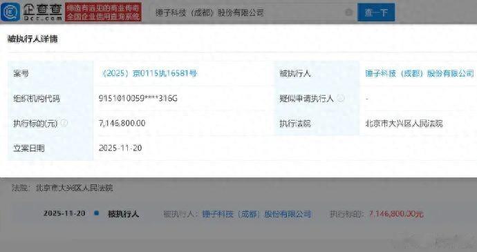 11月25日,@东方财经:企查查APP显示,11月20日,锤子科技(成都)股份有限公司新增一则被执行人信息,执行标的约715万元,执行法院为北京市大兴区人民法院。