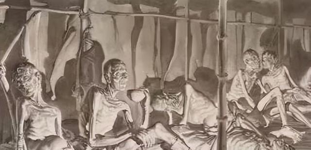 战俘们浑身散发着恶臭,成群的绿头苍蝇紧贴着他们的身体,仿佛一层翠绿的丝绸。这些战俘已经虚弱到连挥手赶走苍蝇的力气都没有了。
