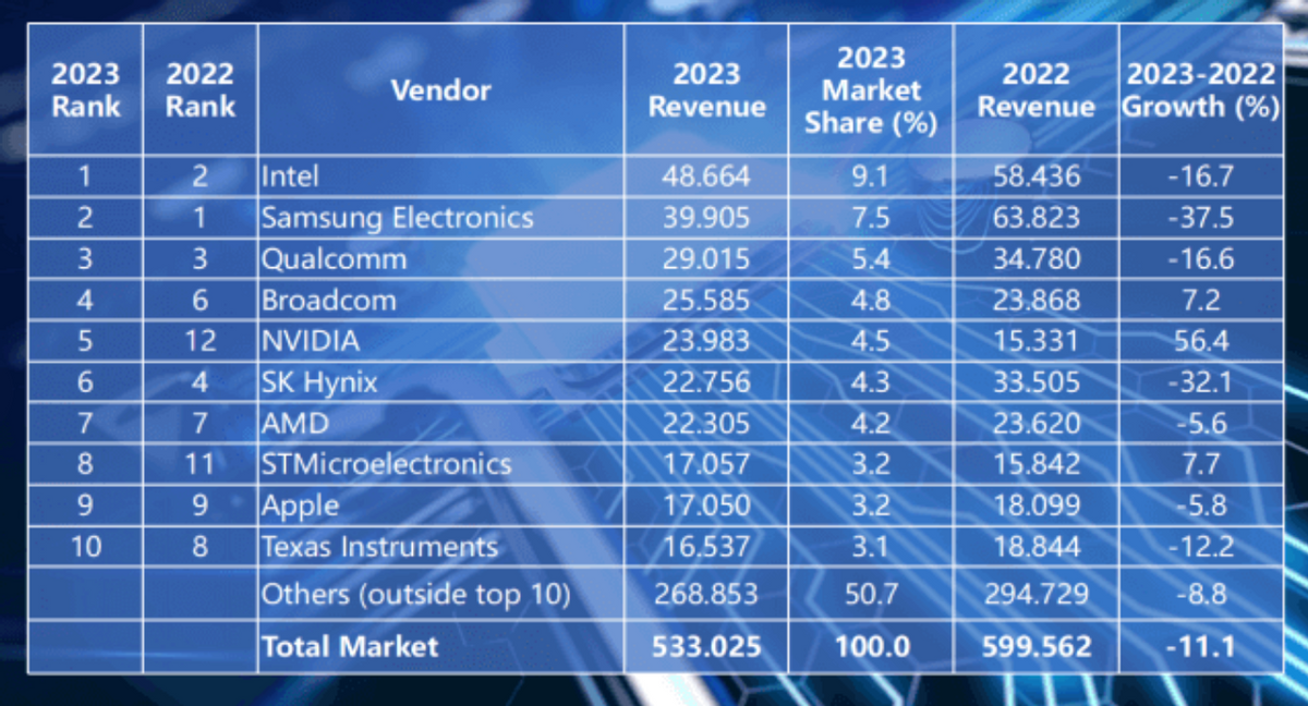 ● 英特尔在连续两年排名第二之后,从三星手中夺回了第一的位置。英特尔2023年营收总计487亿美元,而三星营收达到399亿美元。