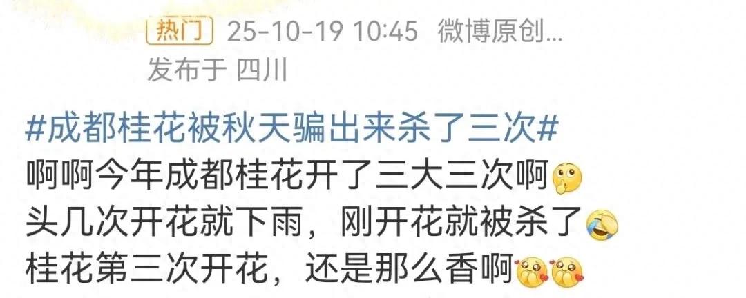 “桂花第三轮开放,主要与近期气温波动和雨水充足有关。”成都市花卉协会副会长祝鸣川指出,今年入秋后气温波动较大,尤其是低温天气后伴随气温回升,加之雨水较为充沛,为花芽萌发提供了必要条件,使桂花植株误以为进入适宜开花的气候条件,从而萌发花芽并开放,产生“返春现象”。