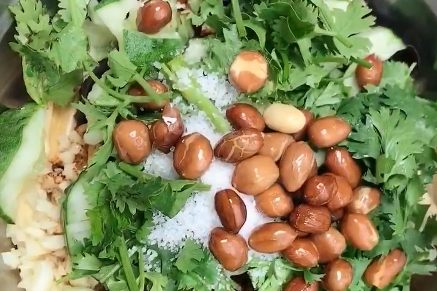 【做法步骤5】下入黄瓜。香菜、盐、鸡精、白糖提鲜,然后放入炸熟的花生米。