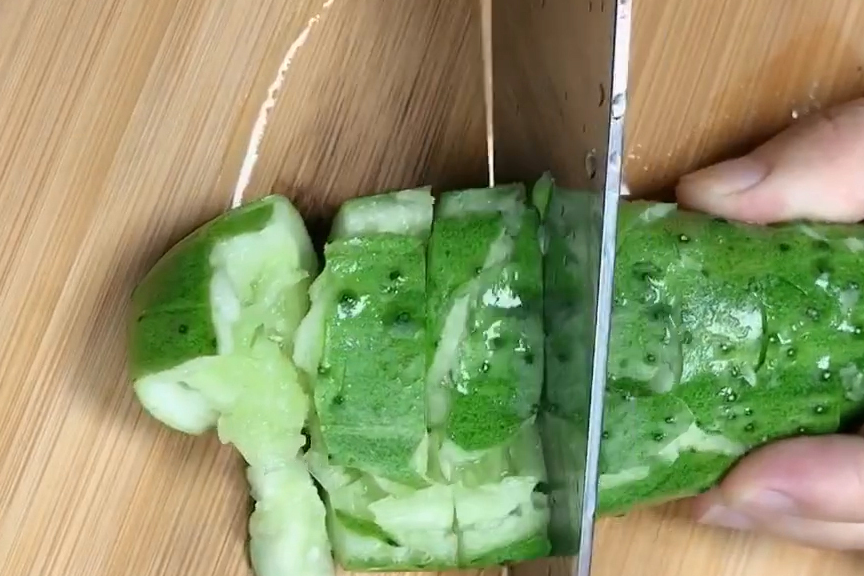 【做法步骤1】首先准备一根不纯洁的黄瓜用擀面杖给它拍碎,切成段。