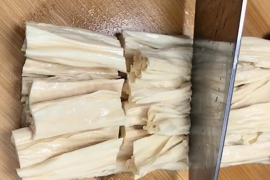 【做法步骤2】腐竹提前用凉白开泡软,给它切断。