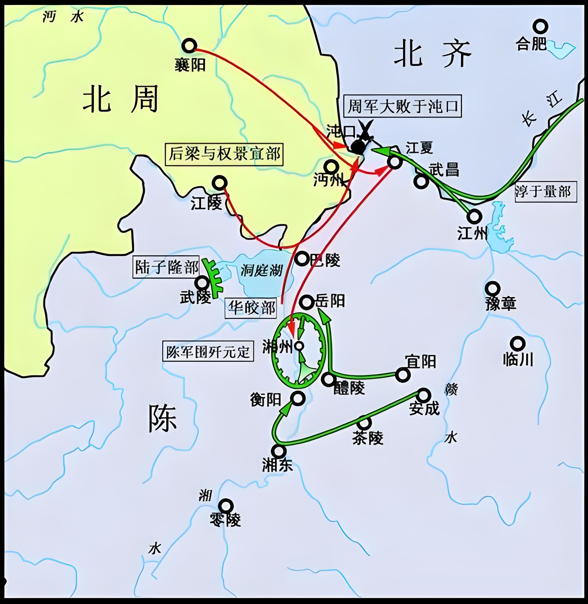 荆州的部队与后梁的水军共同行动,从江陵顺江而下至洞庭湖,与华皎的军队会合,然后继续向东推进,占领郢州,切断陈军沿江进攻的水路。