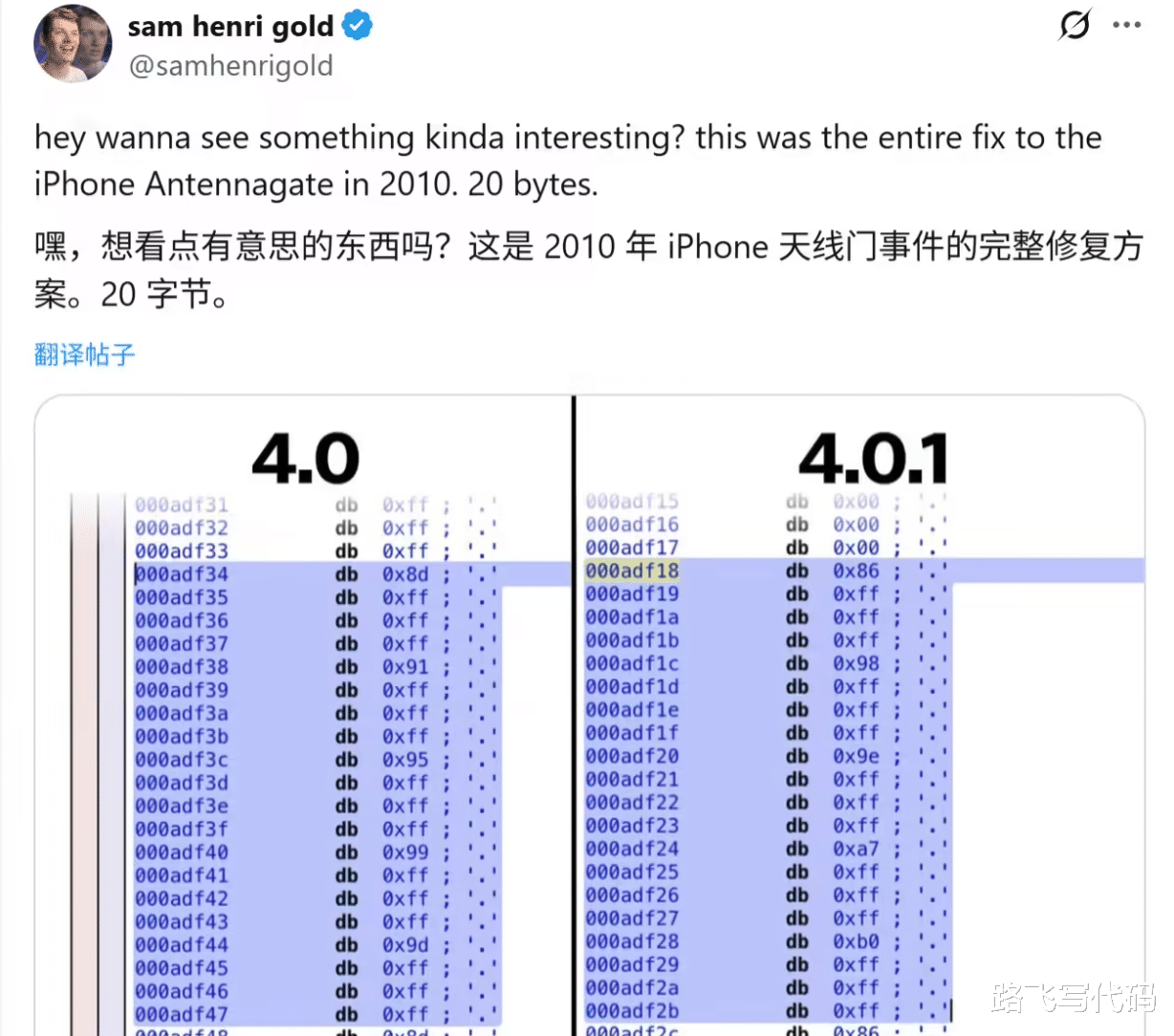 时至今日,国外的软件工程师大神萨姆・亨利・戈尔德专门对比了iOS4和iOS4.0.1两个版本的固件代码,终于找到了当初苹果为了修复“天线门”而修改的代码。