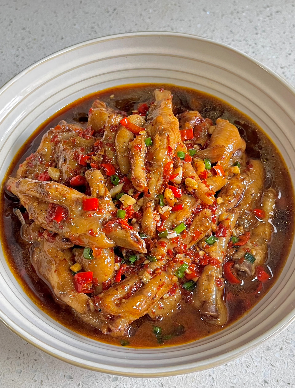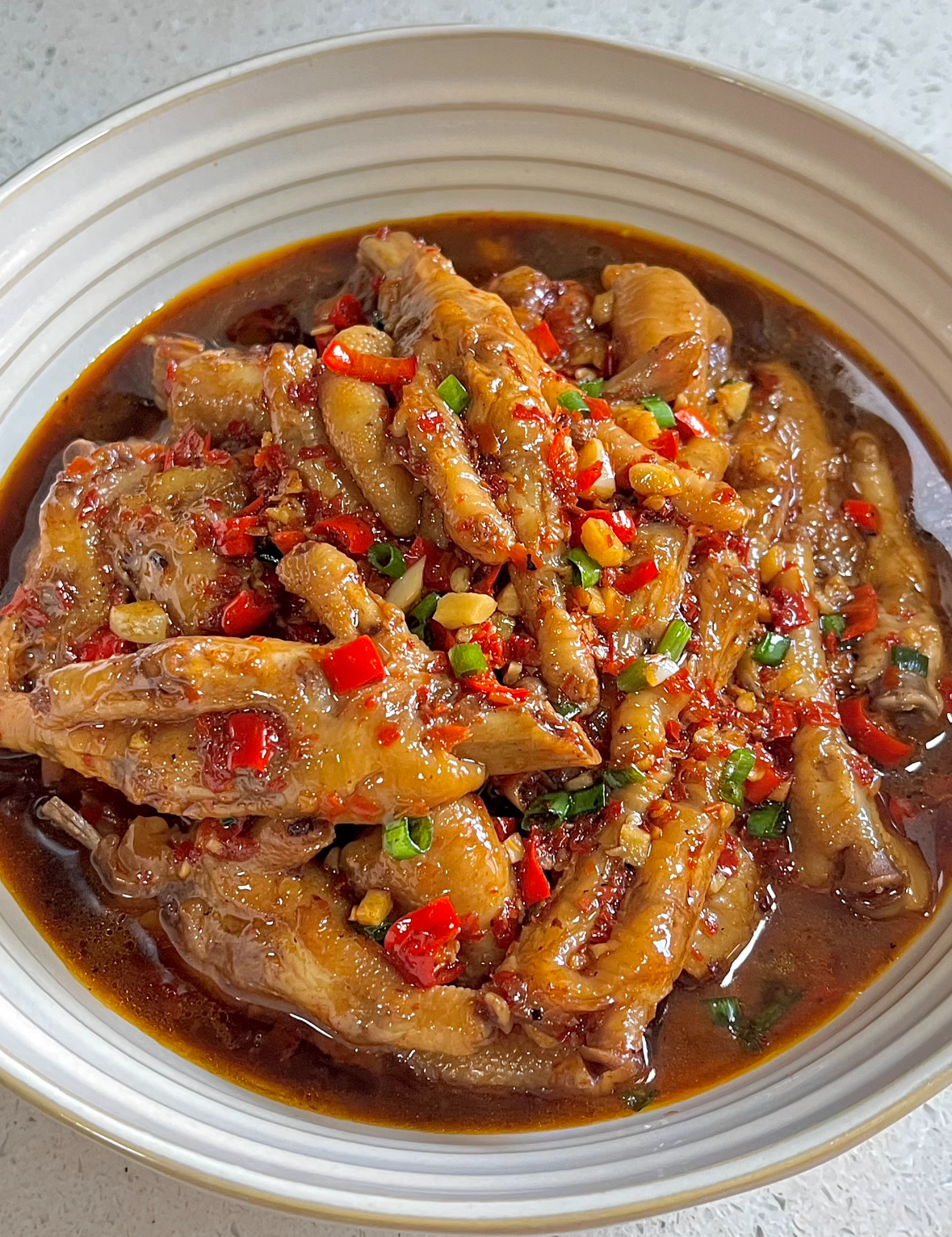 鸡爪预处理。将鸡爪清洗干净,剪掉指甲,然后对半切开,这样更容易入味和食用。接着,鸡爪需要冷水下锅,加入姜片、葱段和料酒进行焯水,水开后煮2-3分钟,撇去浮沫,捞出后用清水冲洗干净。这一步能有效去除腥味,炖煮软化。将处理好的鸡爪放入锅中,加入没过鸡爪的开水,并放入如八角、桂皮、香叶等基础香料,以及生抽、老抽(用于上色)进行炖煮。使用高压锅可以大大节省时间,上汽后压15分钟左右即可达到软糯效果;若用普通锅具,则需要小火慢炖约30-40分钟。炖煮好后,捞出鸡爪,记得保留一碗原汤,后续收汁时非常重要爆香与收汁。这是赋予鸡爪灵魂香辣味的关键。另起一锅,烧热后放油,油热后转中小火,放入大量的蒜末、小米椒碎、干辣椒和辣椒面煸炒,炒出诱人的红油和香味。然后倒入煮软的鸡爪,翻炒均匀,让鸡爪表面裹满香辣料。接着,加入生抽、蚝油、少许白糖(平衡辣味、提鲜)等调味,并倒入之前保留的那碗卤鸡爪的原汤。大火烧开后,转为中火收汁,期间不停翻炒,直到汤汁变得浓稠,能紧紧包裹在每一只鸡爪上。出锅前可以撒上葱花增香。小米椒和干辣椒的用量可根据口味调整。起锅前挤入少许柠檬汁,其酸味能神奇地中和部分灼烧感,让辣味更柔和。想要鸡爪更加软糯不破皮,炖煮时可以加入几片山楂干,有助于胶原蛋白析出。追求双重口感的话,炖好的鸡爪可以用空气炸锅200℃烤5分钟,让表皮微焦带脆。收汁阶段加入一勺香醋,可以瞬间激发复合香气,并解腻增香。使用卤料包(或八角、桂皮等香料)炖煮,能让鸡爪的香味更有层次。江西辣鸡爪不仅是逢年过节寓意“抓钱”的吉祥菜,更是绝佳的下酒菜和追剧零食。剩下的浓郁汤汁千万别浪费,用来拌面条或者拌饭,味道一流。希望这份详细的指南能帮助你成功做出一盘地道的江西辣鸡爪!如果你对辣度或者配菜有其他想法,我很乐意和你一起探讨调整。