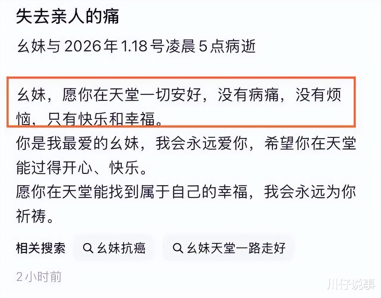 1月18日,一位贵州遵义的博主通过社交平台发文:失去亲人的痛,幺妹于1月18日凌晨5点病逝。幺妹,愿你在天堂一切安好,没有病痛,没有烦恼,只有快乐和幸福。你是我最爱的幺妹,我会永远爱你,希望你在天堂能过得开心、快乐。愿你在天堂能找到属于自己的幸福。
