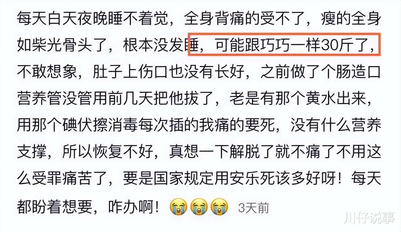 今年1月6日,周艳发文自己的病情已经无药可救了,只能靠营养液维持身体,肚子里全是肿瘤把胃都堵死了,吃啥都吐,根本无法进食,特别热,狂吃冰棍。