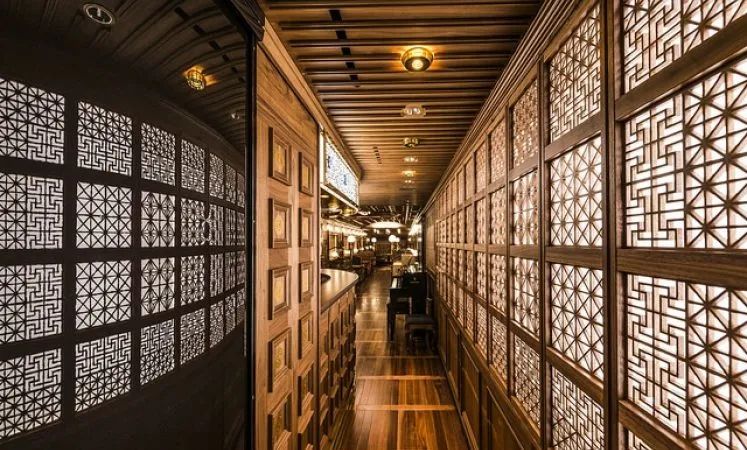 普通套房虽然面积不大,但还是保留了起居室和盥洗室的空间,搭配上九州的各种手工艺品,细节感满满。而且每个房间的材料和风格也不尽相同,即使坐几次,都会有不同的体验。1号车厢名为 Blue Moon「蓝月」,这里是是七星号的社交车厢,也是七星号主打特色之一。这个车厢的装潢最为华丽,天花板是在金属上方贴天然防燃木皮后,再以贴金箔的方式把三种七星LOGO贴敷上去。中央的吊灯是丹麦国宝级品牌的灯具,也是全车唯一的非量身定制品。车厢中间有小型舞台,可举办高雅优美的钢琴演奏、神秘莫测的魔术秀、展现九州和日本传统文化的艺术表演等丰富多彩的节目。