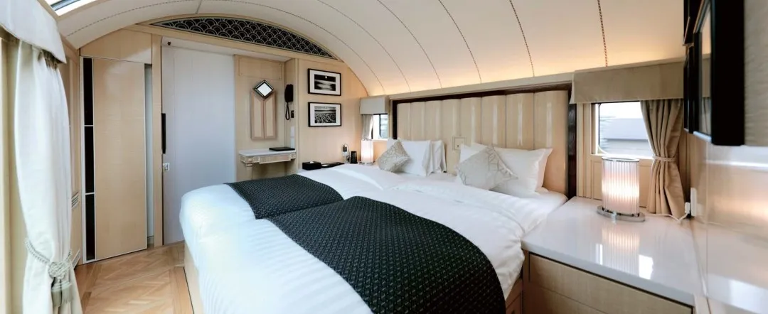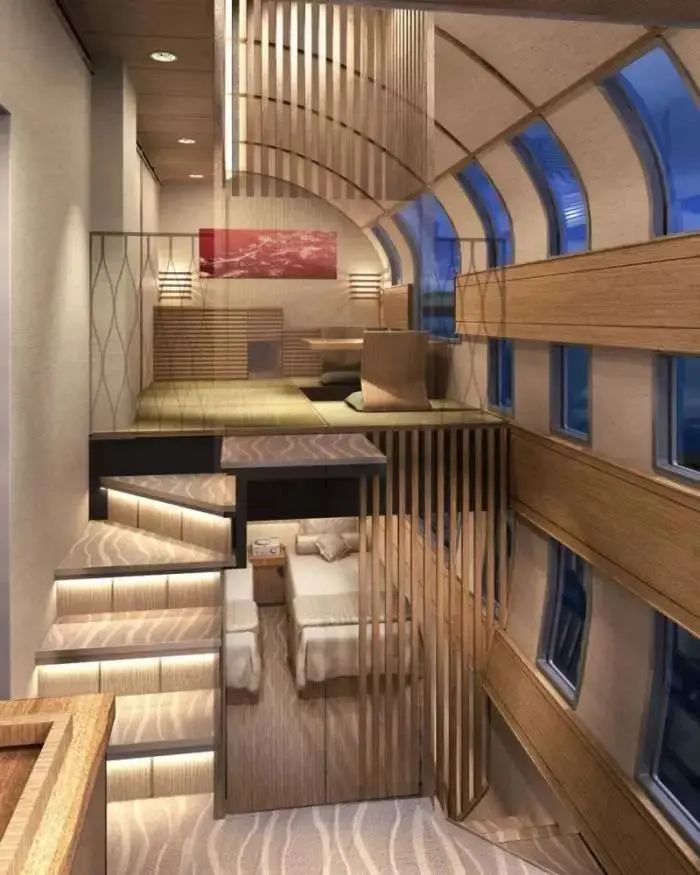 而7号车厢则是全车唯一一间顶级套房,整个车厢都属于一个房间,要知道在日本这个把空间利用发挥到极致的国家,一节车厢就一个房间简直是不可思议的地方。这个房间不仅有专属的客厅,浴室里面还有浴缸可以泡澡,甚至连吃饭都可以在这里面私密用餐,在全世界奢游列车里面都不多见!