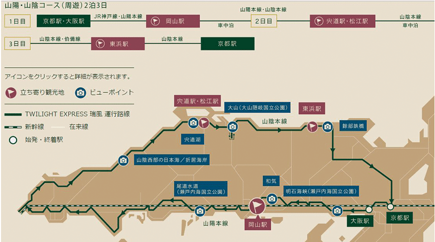 2年后,继承了“TWILIGHT EXPRESS”名字和涂装色系的“TWILIGHT EXPRESS 瑞风”正式运营,而与大阪到札幌的线路不同,TWILIGHT EXPRESS瑞风号是由西日本运营的,所以TWILIGHT EXPRESS 瑞风号行驶的区间换成了大阪到下关,也就是我们常说的山阴本线和山阳本线。