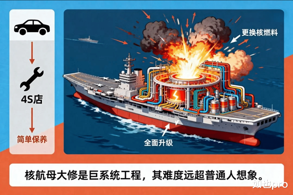 它几乎等于把航母彻底拆解,更换核反应堆,再进行全面的现代化升级,整个过程动辄持续数年。