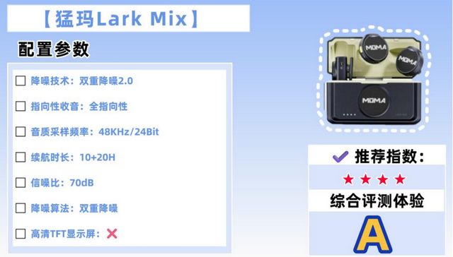 在专业级的领夹麦克风中,QMic全面优于同类标准,48kHz采样率+24Bit位深带来录音棚级音质,人声还原度高达98%以上,支持重度/轻度双档降噪与20档增益调节,并搭载三重防爆音抑制系统让爆音削减90%以上。双核DSP并行架构配合AI-DNN2.5神经网络降噪与WindSense2.0风噪识别,让复杂环境下依旧纯净稳定,鲸语Comm通信技术实现250米稳定收音,配置性能直接拉满,可以算得上是目前千元级领夹麦克风的巅峰之作。