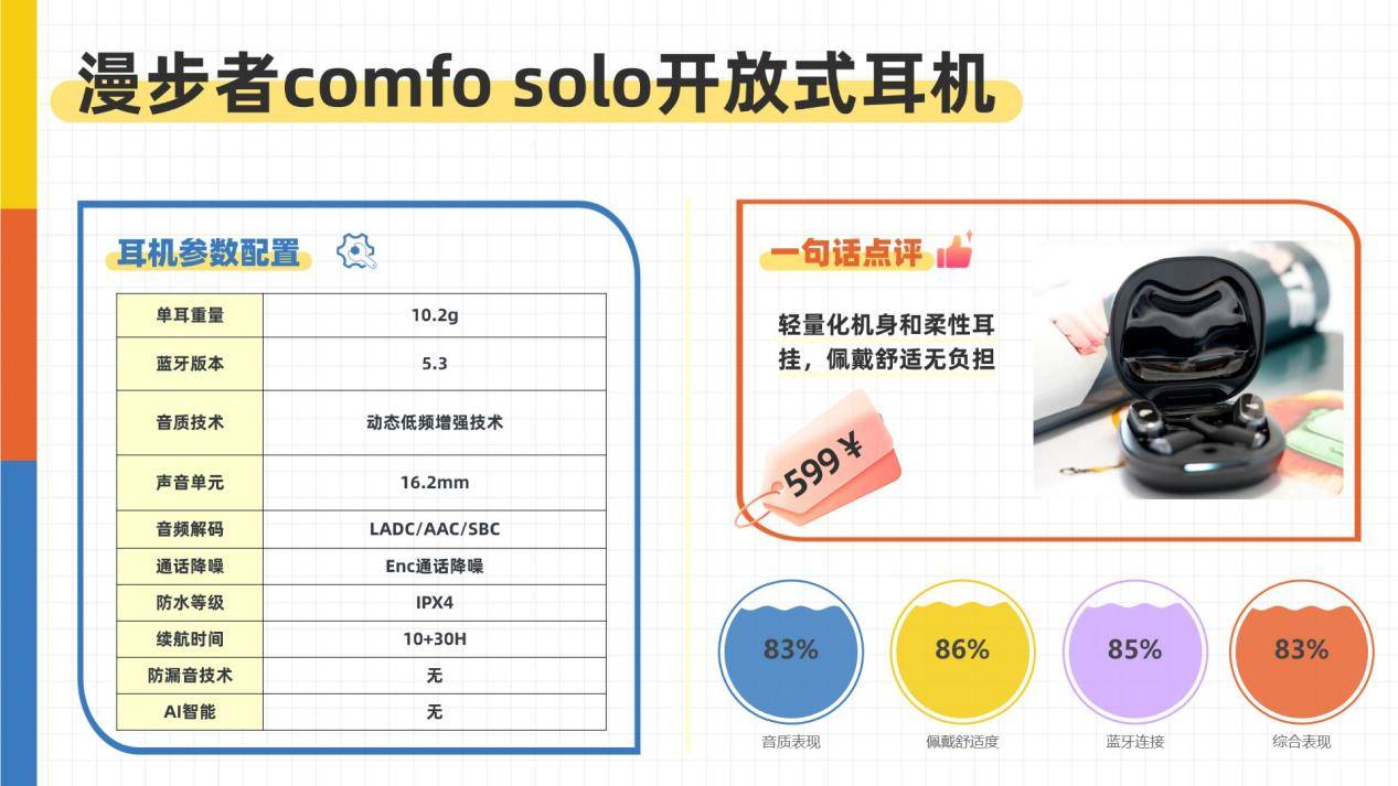 音质表现上,Comfo Solo融合动态低频增强技术,结合创新空气声腔架构,提供更宽广的频响范围与强劲磁驱力,声音细节清晰可辨,带来真正的HI-FI级听音体验。它通过 HI-Res 小金标认证,音质参数比普通耳机提升约3倍,非常适合追求高品质音效的用户。