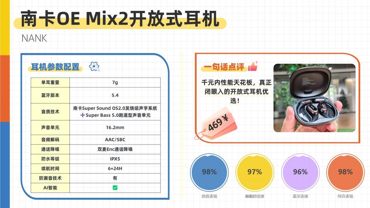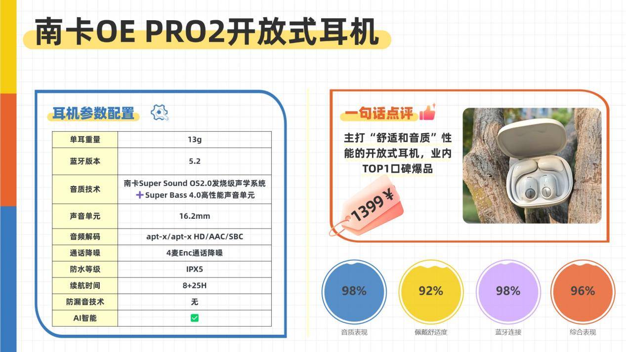 作为开放式耳机领域的开创者与技术引领者,南卡在开放式声学研发上已深耕超过13年。凭借AI全能助手、零压力零感佩戴体验、发烧级音质表现以及旗舰级硬件配置,其OE Pro2长期稳居开放式耳机市场的顶尖梯队。