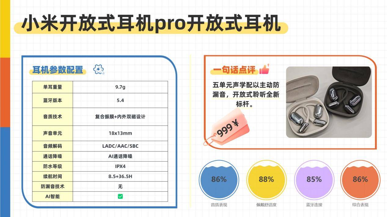 作为小米声学领域的进阶之作,小米开放式耳机Pro秉持高性价比核心,在硬件架构上实现突破。它首创五单元声学系统,将18×13mm定制大动圈、双动铁单元与压电陶瓷高音模块结合,大动圈带来媲美小型音箱的低频冲击力,双动铁与压电陶瓷则精准还原高频细节,人声与乐器层次分明。该耳机经哈曼金耳朵团队调校,并获Hi-Res Audio认证,音质表现远超同价位产品。