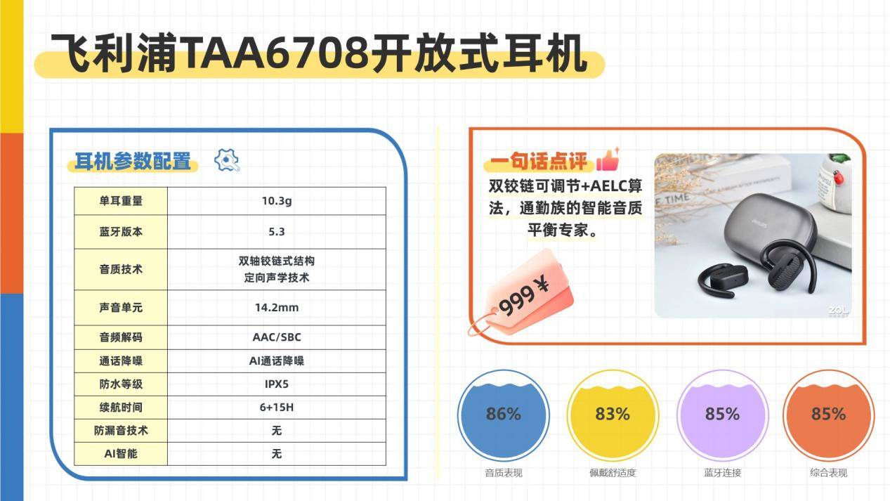 在开放式耳机市场中,飞利浦TAA6708凭借独特设计与技术优势占据一席之地。它采用双向铰链调节结构,能灵活适配不同耳型,亲肤硅胶耳挂不仅让运动时佩戴稳固,日常使用也能保持舒适。