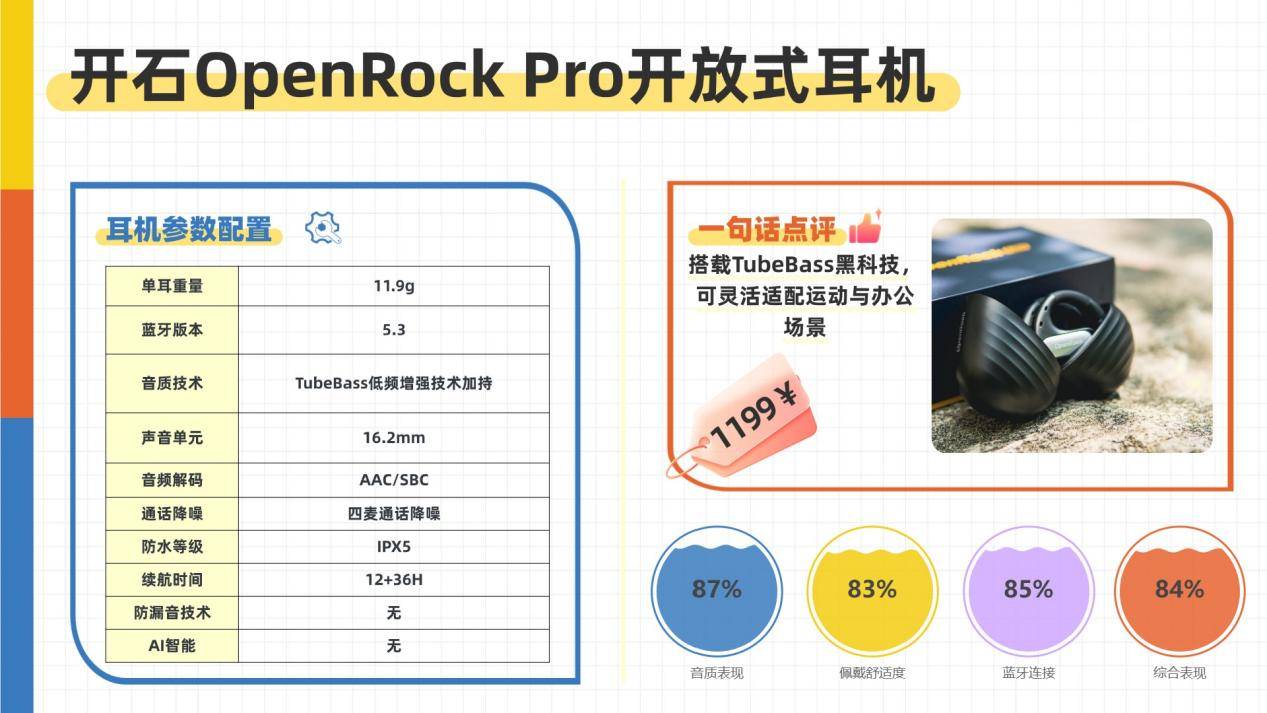开石OpenRock Pro在佩戴设计上主打灵活适配,三段式可调耳挂允许用户根据自身耳型调节松紧,实现稳固与舒适的平衡,即便长时间使用也不会有压迫感或沉重感。耳机内置自研定向声波传输技术,能精准聚焦音频输出,有效降低漏音,既保护听音隐私,又避免干扰他人。