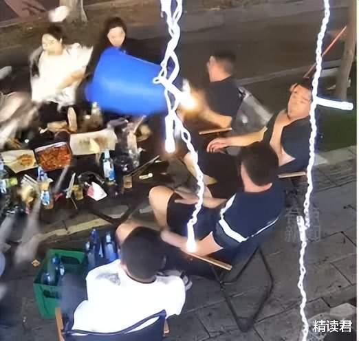 可能是没有成功卖出产品,男子觉得丢了面子,没过一会儿,他从另一个方向折返回来,举着装满垃圾的垃圾桶,毫不犹豫向食客这桌砸来。