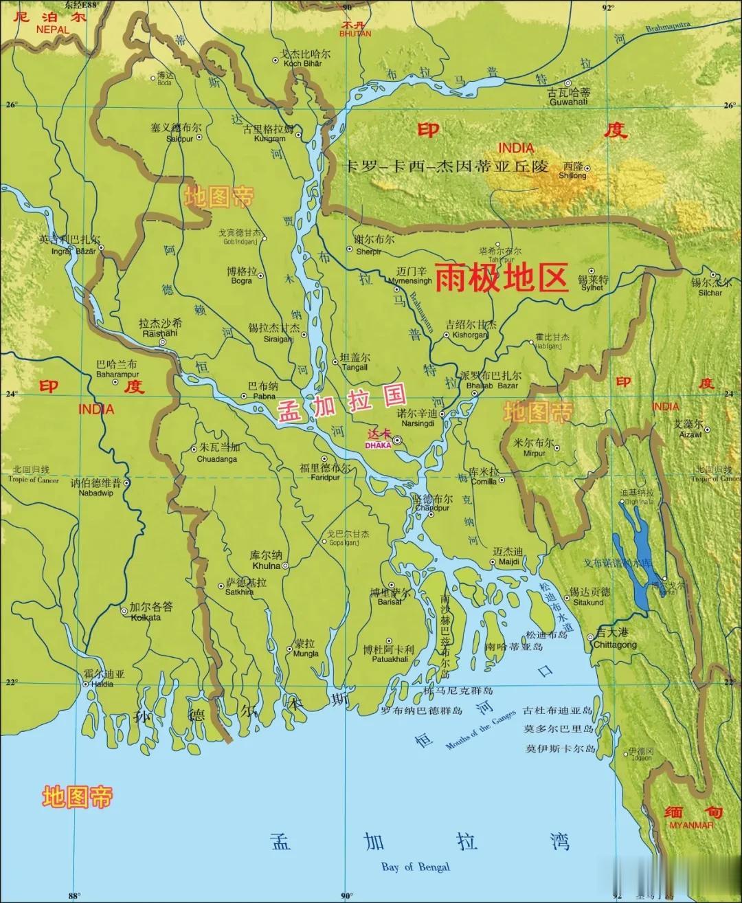 喜马拉雅山脉以南,恒河流域、雅鲁藏布江下游,是全球雨量最大的地区之一。孟加拉国东北部有个雨极地区,是卡罗-卡西-杰因迪亚丘陵、那加丘陵、若开山脉围城的三角区域。印度洋孟加拉湾的西南季风进入这个地区,带来大量的水汽。这个区域三面环山,水汽除了形成降雨,几乎无路可去,出口还有源源不断的水汽涌入,形成巨量降雨,称为雨极地区。